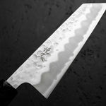 Japanese White Steel #2, a traditional high-carbon steel, is cherished for its purity and fine grain structure, enabling razor-sharp edges, at the cost of being reactive. It is one of the easiest steels to sharpen, but cannot be left wet for even short periods otherwise rust spots can occur. If you’re fastidious in your knife maintenance, this knife steel can be extremely rewarding to use.