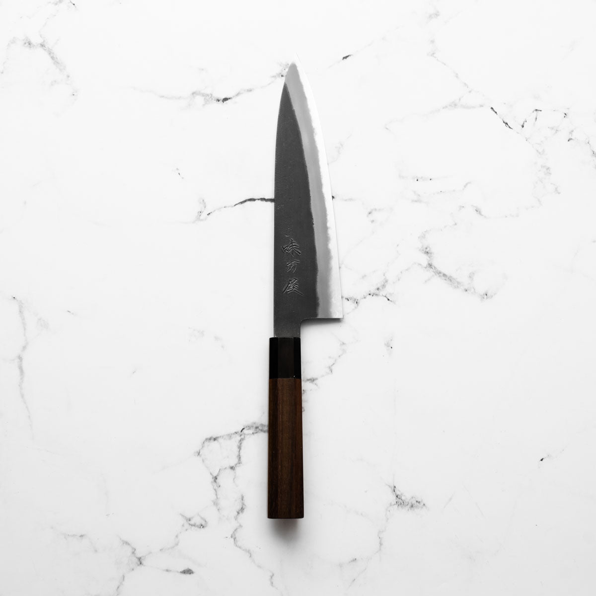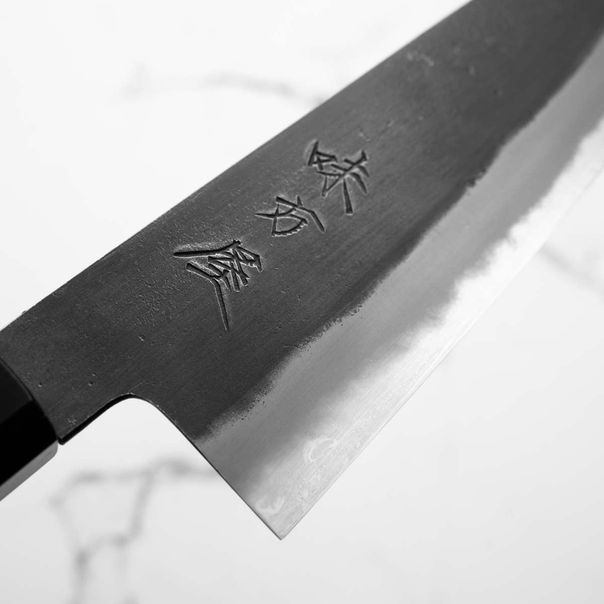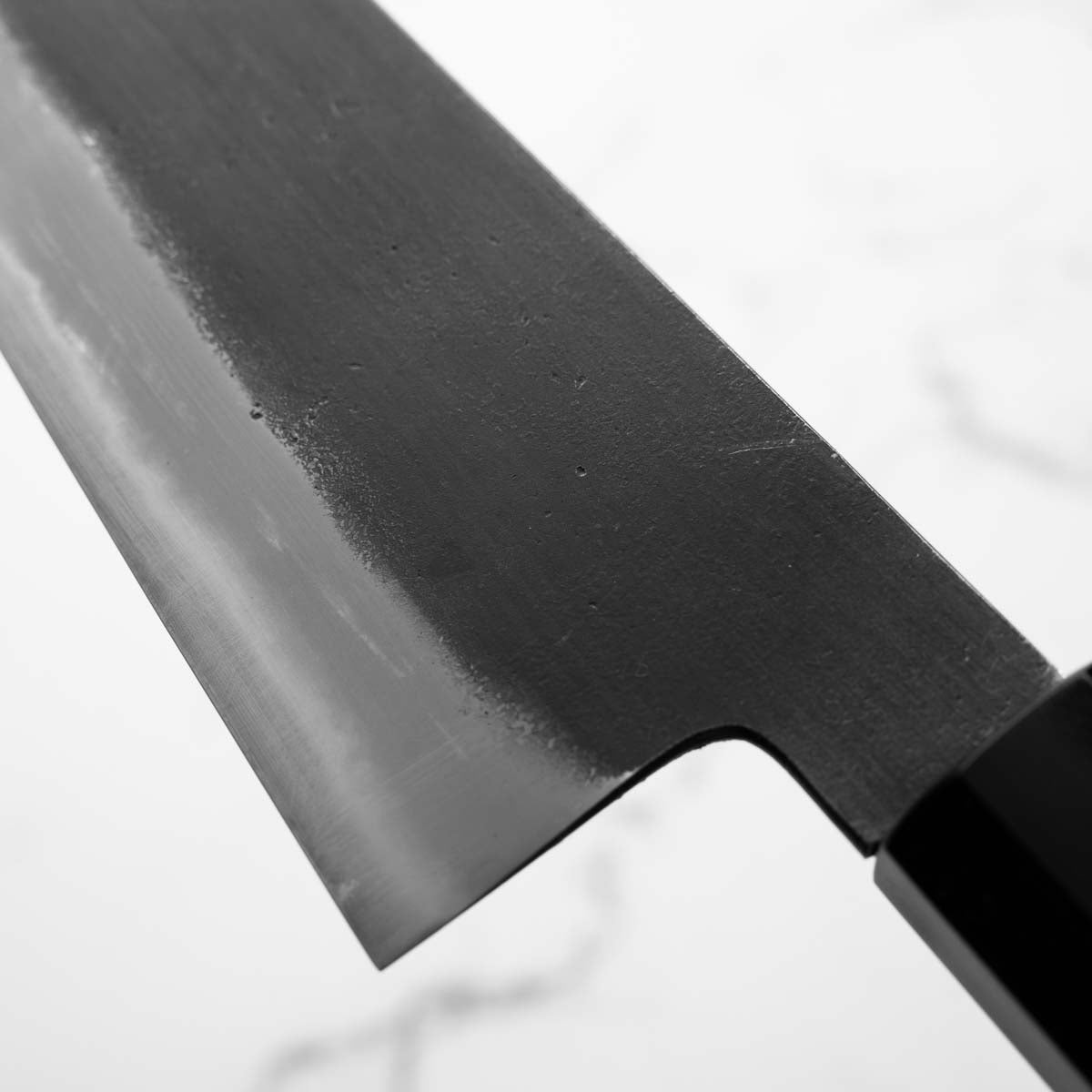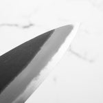 Japanese White Steel #2, a traditional high-carbon steel, is cherished for its purity and fine grain structure, enabling razor-sharp edges, at the cost of being reactive. It is one of the easiest steels to sharpen, but cannot be left wet for even short periods otherwise rust spots can occur. If you’re fastidious in your knife maintenance, this knife steel can be extremely rewarding to use.
