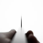 Japanese White Steel #2, a traditional high-carbon steel, is cherished for its purity and fine grain structure, enabling razor-sharp edges, at the cost of being reactive. It is one of the easiest steels to sharpen, but cannot be left wet for even short periods otherwise rust spots can occur. If you’re fastidious in your knife maintenance, this knife steel can be extremely rewarding to use.