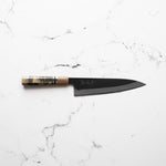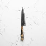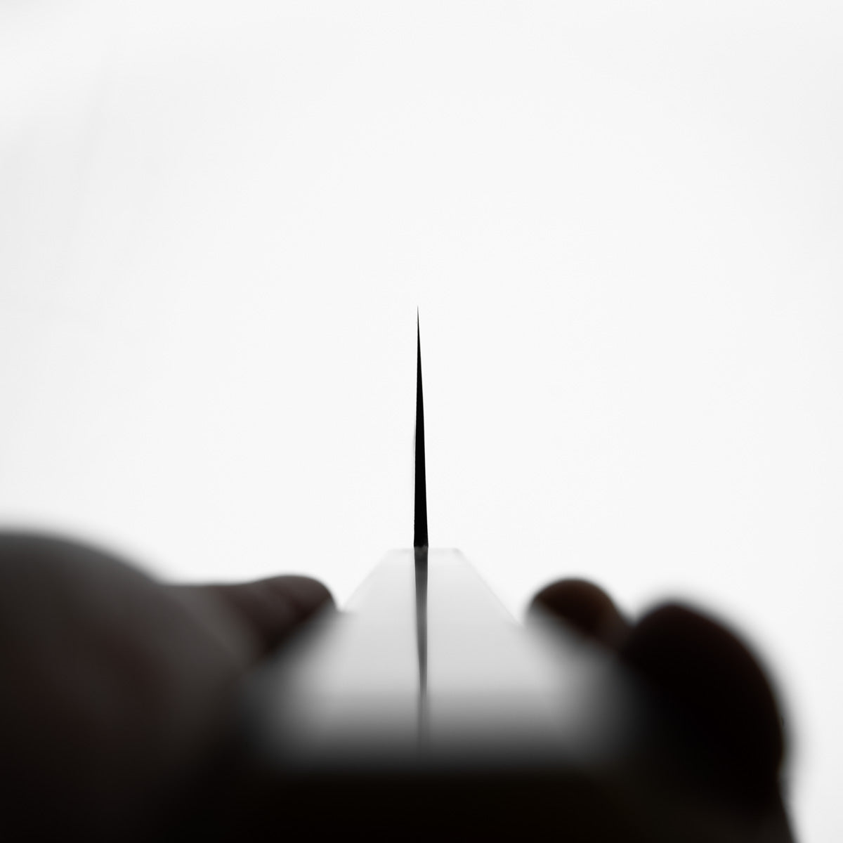 Japanese White Steel #2, a traditional high-carbon steel, is cherished for its purity and fine grain structure, enabling razor-sharp edges, at the cost of being reactive. It is one of the easiest steels to sharpen, but cannot be left wet for even short periods otherwise rust spots can occur. If you’re fastidious in your knife maintenance, this knife steel can be extremely rewarding to use.
