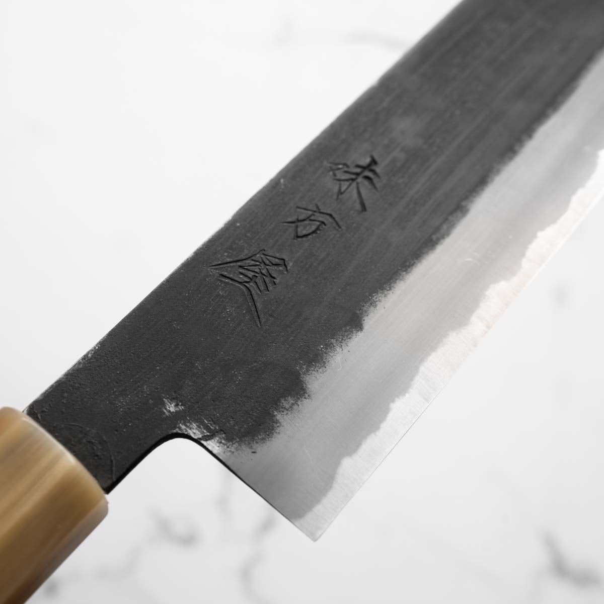 Japanese White Steel #2, a traditional high-carbon steel, is cherished for its purity and fine grain structure, enabling razor-sharp edges, at the cost of being reactive. It is one of the easiest steels to sharpen, but cannot be left wet for even short periods otherwise rust spots can occur. If you’re fastidious in your knife maintenance, this knife steel can be extremely rewarding to use.