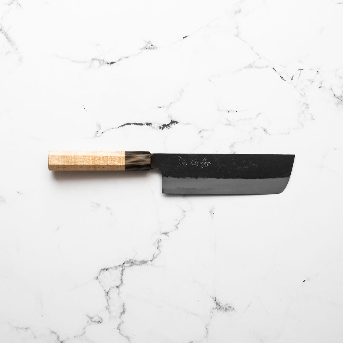 Japanese White Steel #2, a traditional high-carbon steel, is cherished for its purity and fine grain structure, enabling razor-sharp edges, at the cost of being reactive. It is one of the easiest steels to sharpen, but cannot be left wet for even short periods otherwise rust spots can occur. If you’re fastidious in your knife maintenance, this knife steel can be extremely rewarding to use.