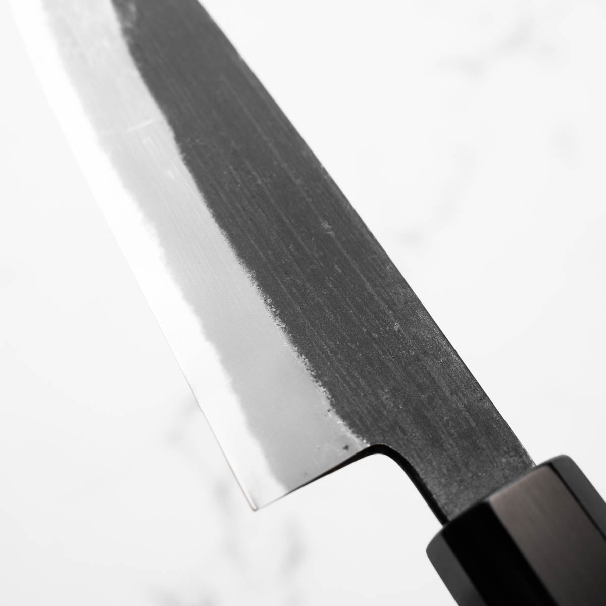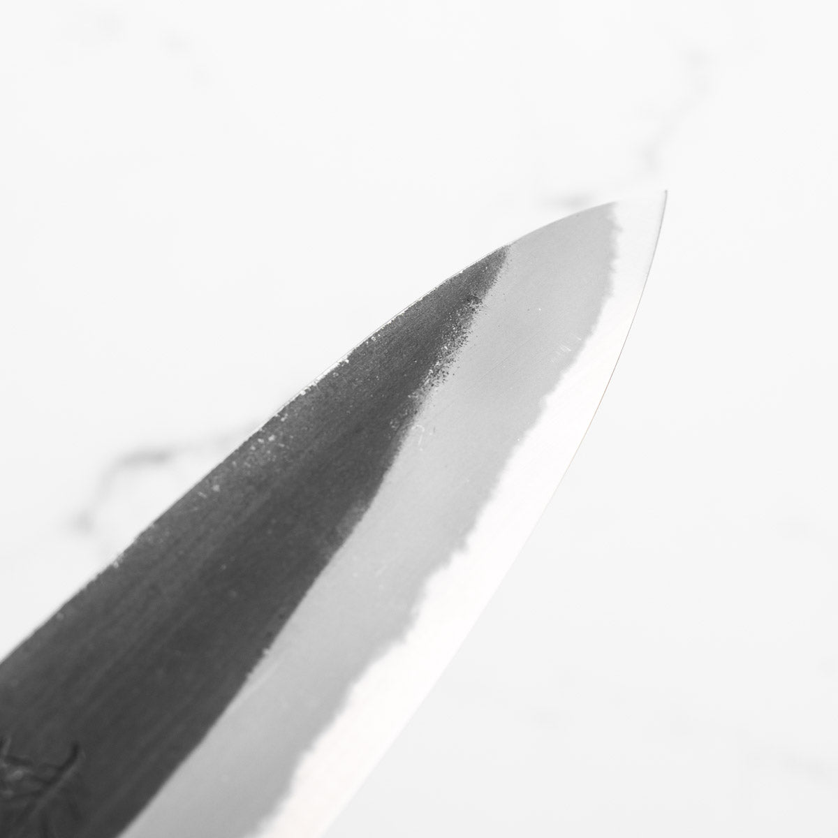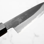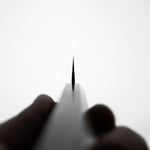 Japanese White Steel #2, a traditional high-carbon steel, is cherished for its purity and fine grain structure, enabling razor-sharp edges, at the cost of being reactive. It is one of the easiest steels to sharpen, but cannot be left wet for even short periods otherwise rust spots can occur. If you’re fastidious in your knife maintenance, this knife steel can be extremely rewarding to use.