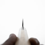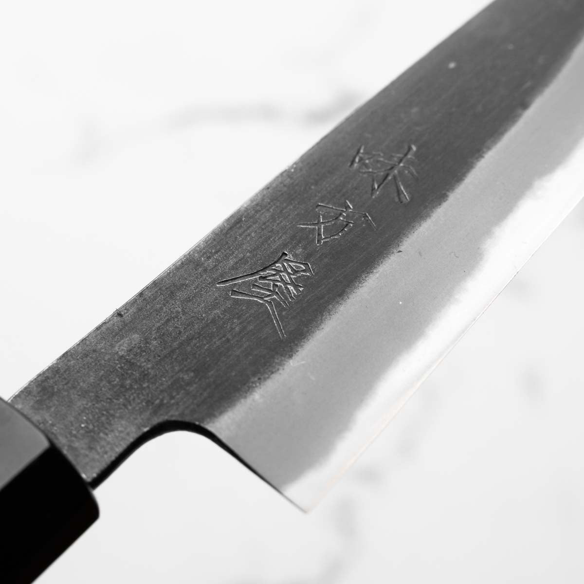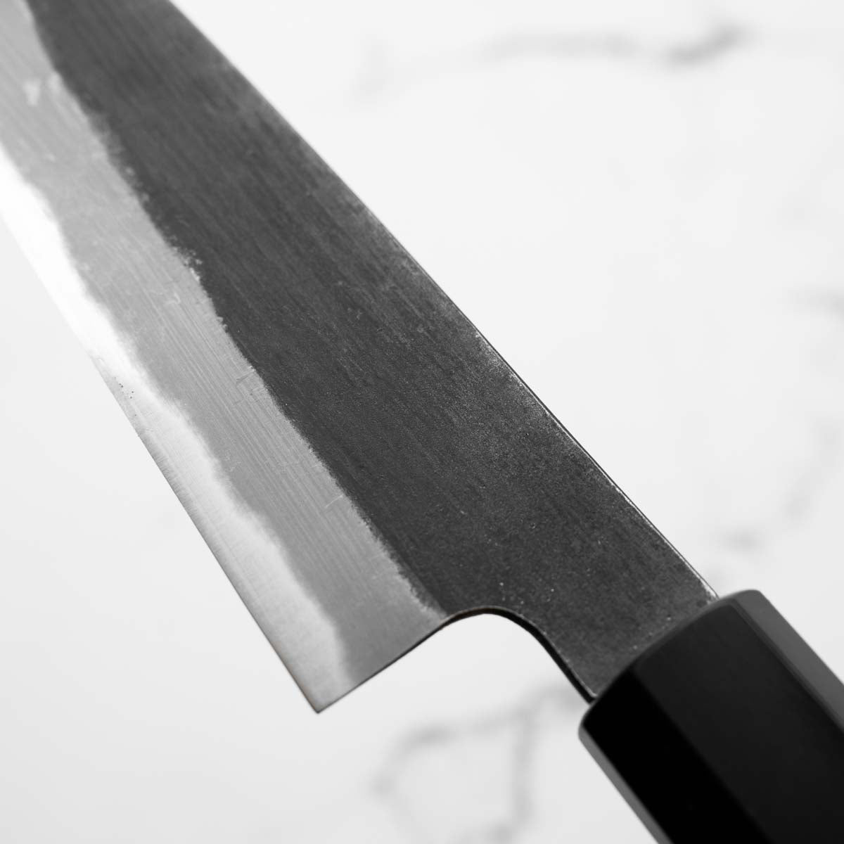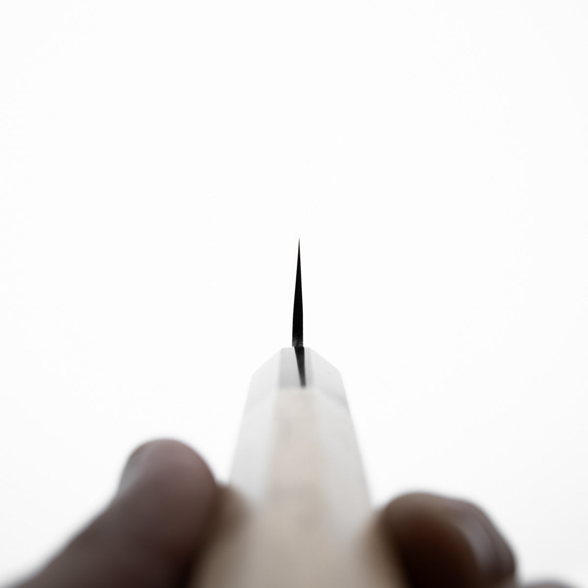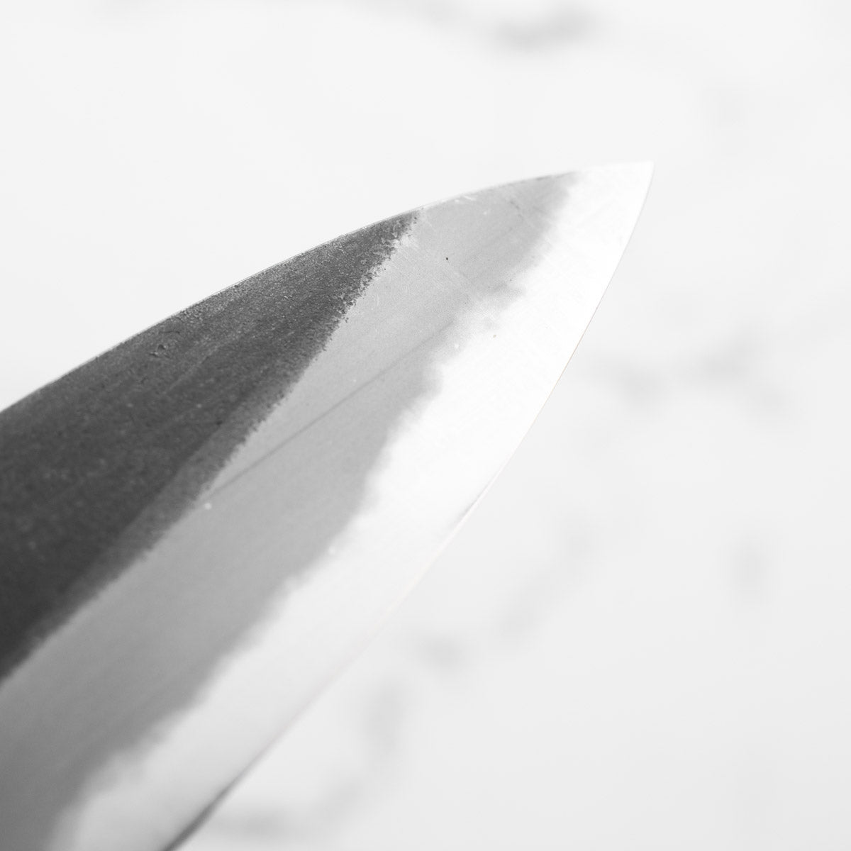 Japanese White Steel #2, a traditional high-carbon steel, is cherished for its purity and fine grain structure, enabling razor-sharp edges, at the cost of being reactive. It is one of the easiest steels to sharpen, but cannot be left wet for even short periods otherwise rust spots can occur. If you’re fastidious in your knife maintenance, this knife steel can be extremely rewarding to use.