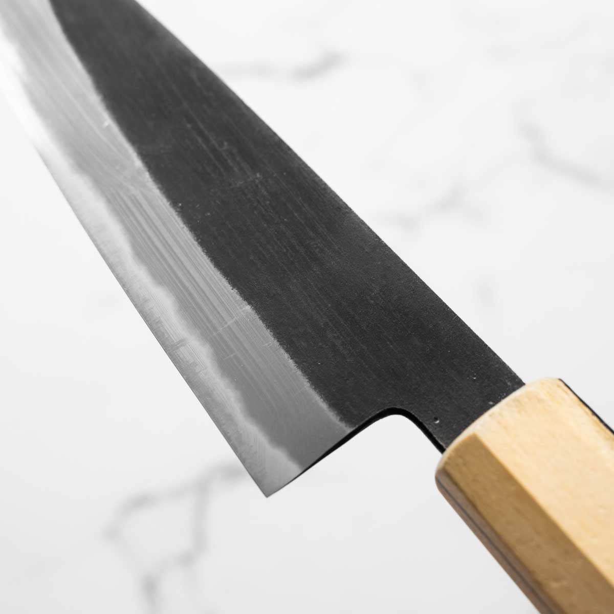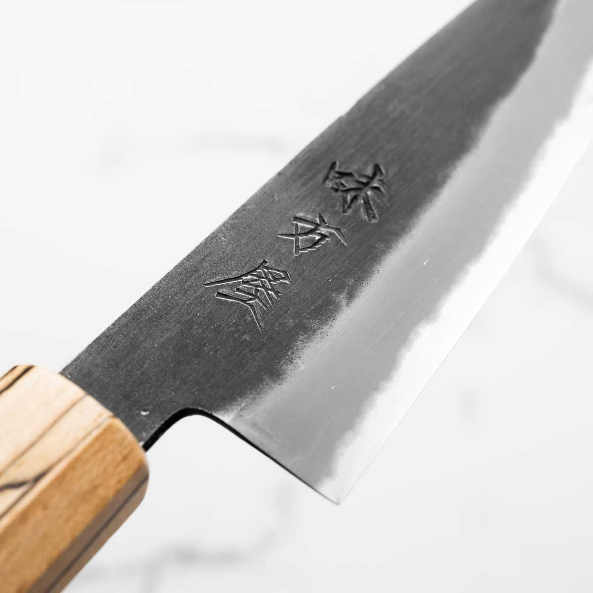 Japanese White Steel #2, a traditional high-carbon steel, is cherished for its purity and fine grain structure, enabling razor-sharp edges, at the cost of being reactive. It is one of the easiest steels to sharpen, but cannot be left wet for even short periods otherwise rust spots can occur. If you’re fastidious in your knife maintenance, this knife steel can be extremely rewarding to use.