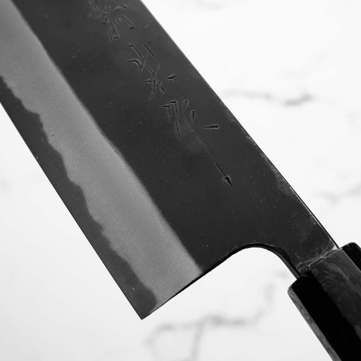 This knife is made from a high-carbon steel and as such, will require a little more care than a regular off-the-shelf knife. It must be dried shortly after use, as prolonged exposure to moisture can cause rust spots to appear. A very light coat of oil during storage also helps to prevent rust spots. A patina (colouration and seasoning of the steel) will occur with use.
