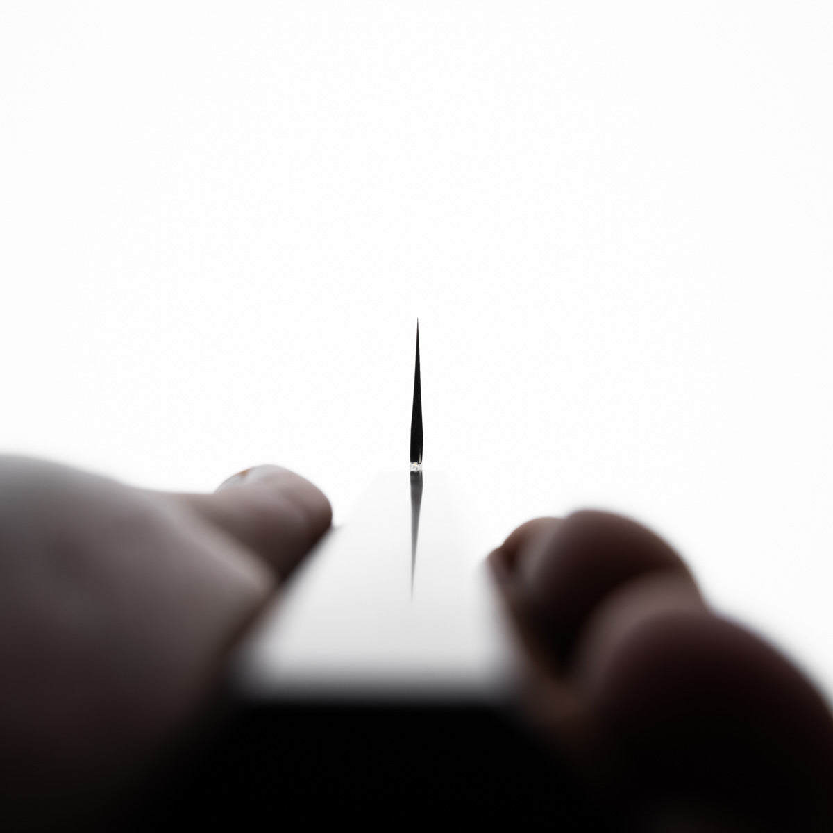 This knife is made from a high-carbon steel and as such, will require a little more care than a regular off-the-shelf knife. It must be dried shortly after use, as prolonged exposure to moisture can cause rust spots to appear. A very light coat of oil during storage also helps to prevent rust spots. A patina (colouration and seasoning of the steel) will occur with use.