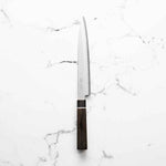 The Yanagiba knife, a staple in traditional Japanese cuisine, is a slender, long-bladed knife primarily used for slicing sashimi and sushi. Its graceful, single-beveled edge guarantees precise, thin cuts, preserving the texture and integrity of the fish. Revered for its sharpness and balance, the Yanagiba is essential for authentic Japanese food preparation.