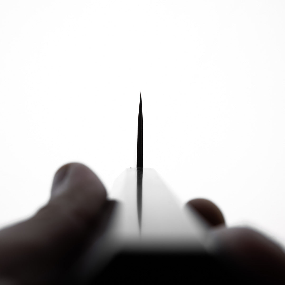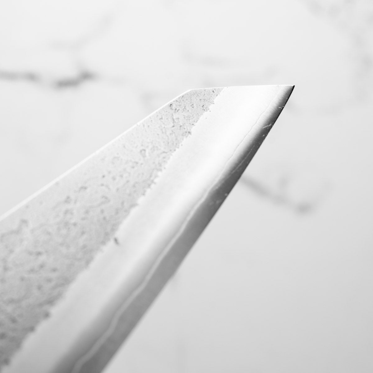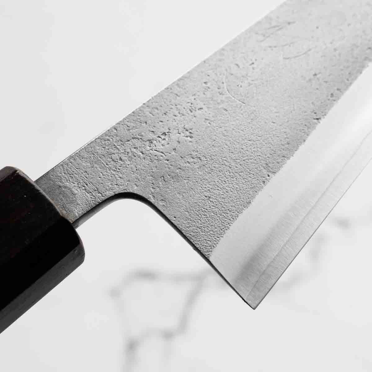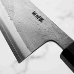 One of their most celebrated offerings is the SKD steel series — featuring a semi-stainless high-carbon core clad in stainless steel. The blades showcase a distinctive wide-bevel grind with a shallow hammer texture that sits stylistically between nashiji and kurouchi finishes. Paired with traditional burnt chestnut handles, each knife reflects Yoshikane’s dedication to consistency, craftsmanship, and timeless design.