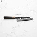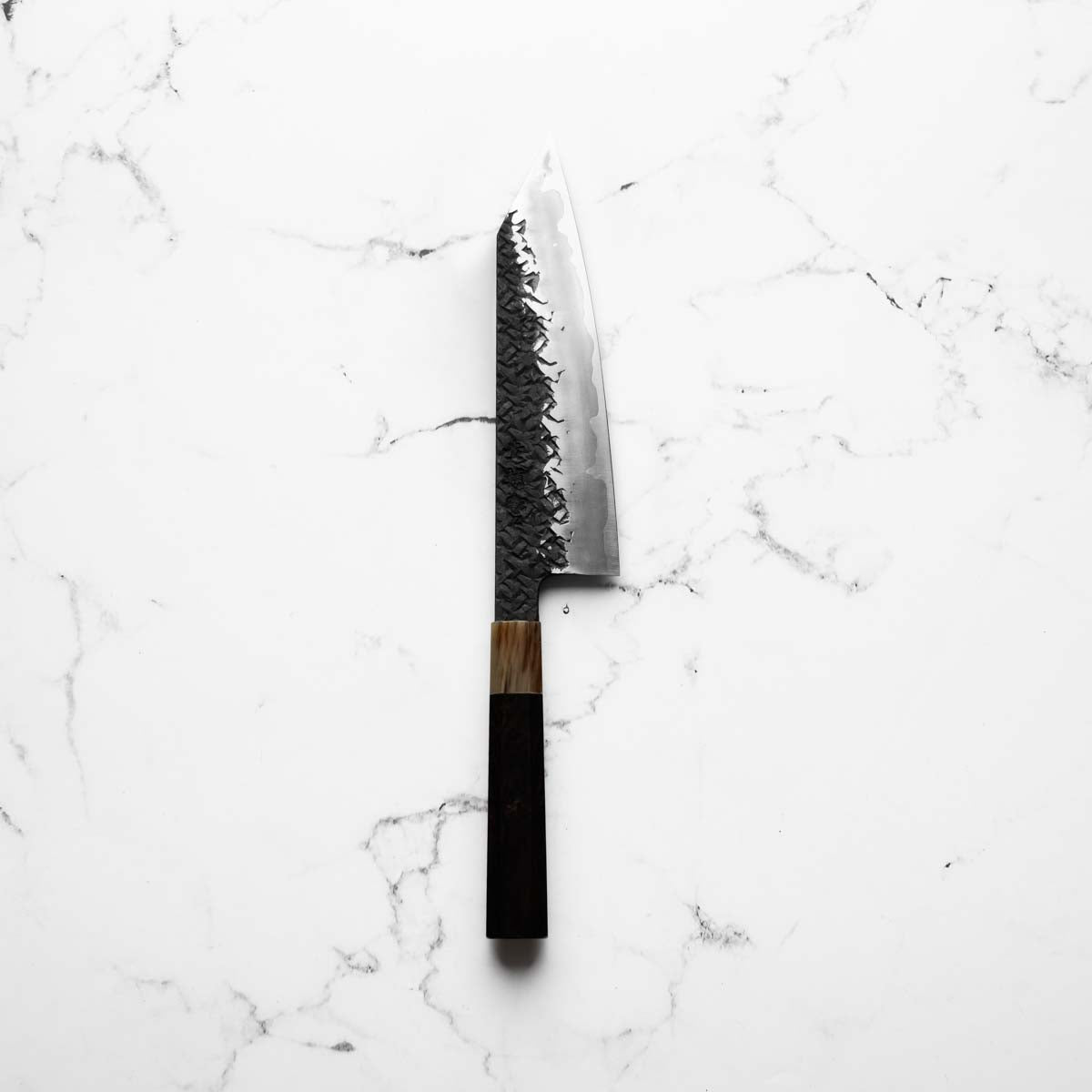Embracing a rapid rise in popularity for his unique designs and committment to striving for perfection, Shunsuke Manaka is the man behind Kisuke knives. From the sketchbook to the kitchen, he is the sole craftsman behind the entire knifemaking process. Shunsuke engineers these knives using a process known as Warikomi, whereby a glowing hot piece of steel is split, and the core steel is wedged in and forged together. The split steel becomes the outer layers, and the core steel is exposed at the edge. This process produces a stronger, tougher more durable blade.