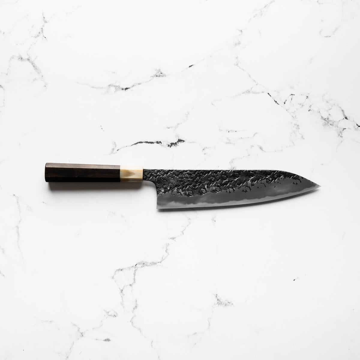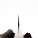 Embracing a rapid rise in popularity for his unique designs and committment to striving for perfection, Shunsuke Manaka is the man behind Kisuke knives. From the sketchbook to the kitchen, he is the sole craftsman behind the entire knifemaking process. Shunsuke engineers these knives using a process known as Warikomi, whereby a glowing hot piece of steel is split, and the core steel is wedged in and forged together. The split steel becomes the outer layers, and the core steel is exposed at the edge. This process produces a stronger, tougher more durable blade.