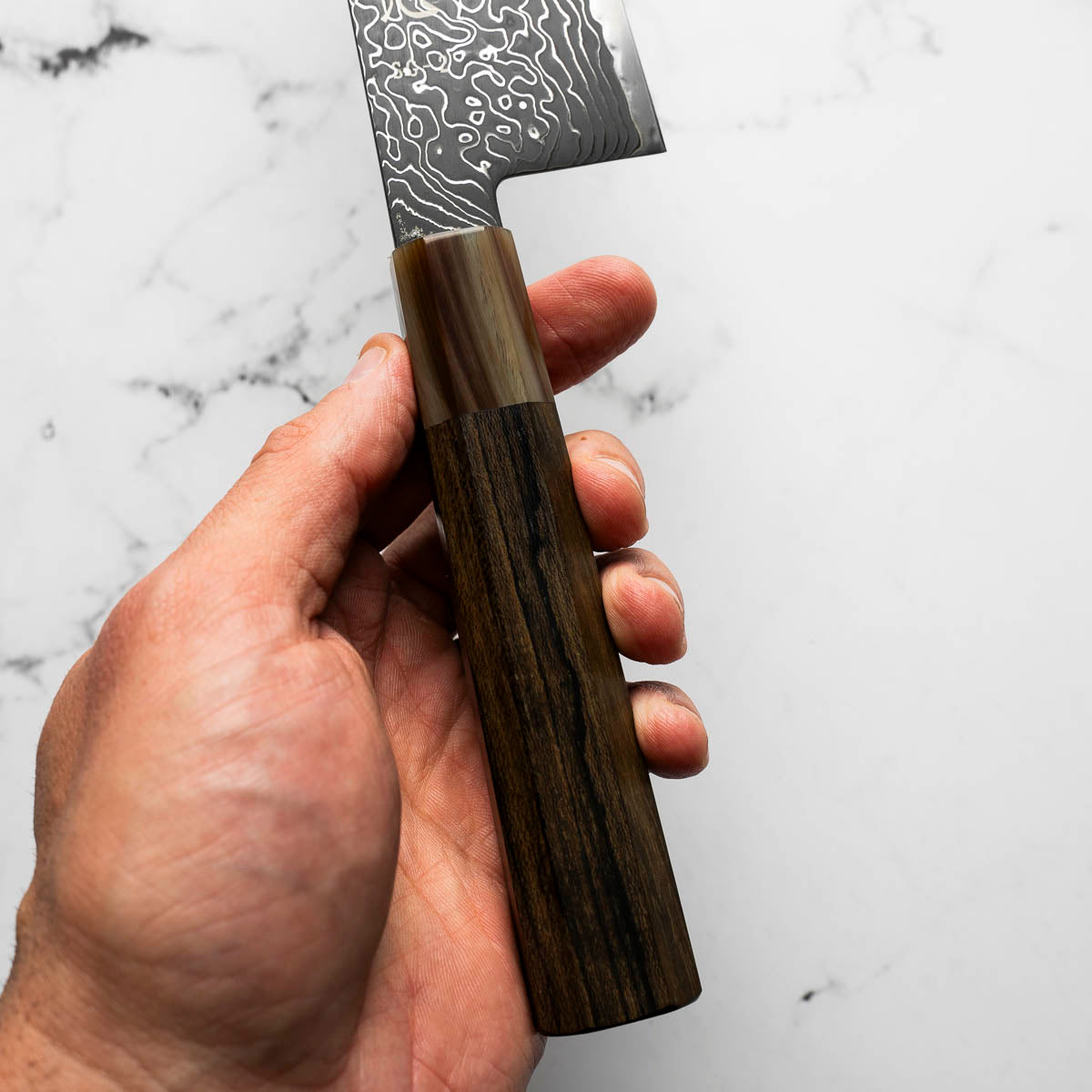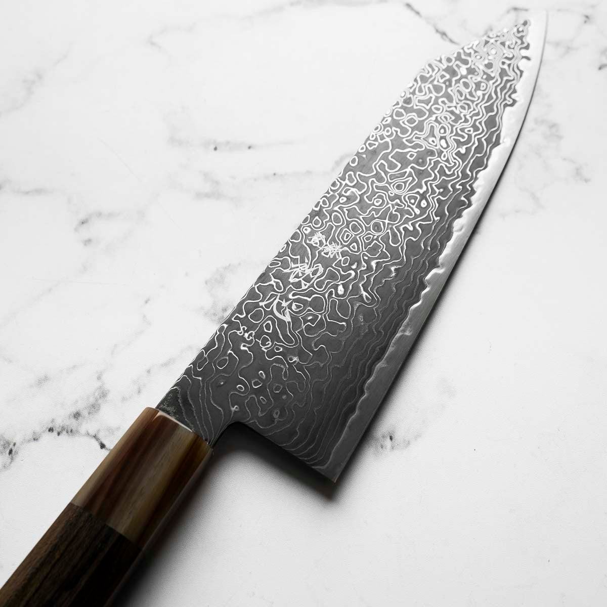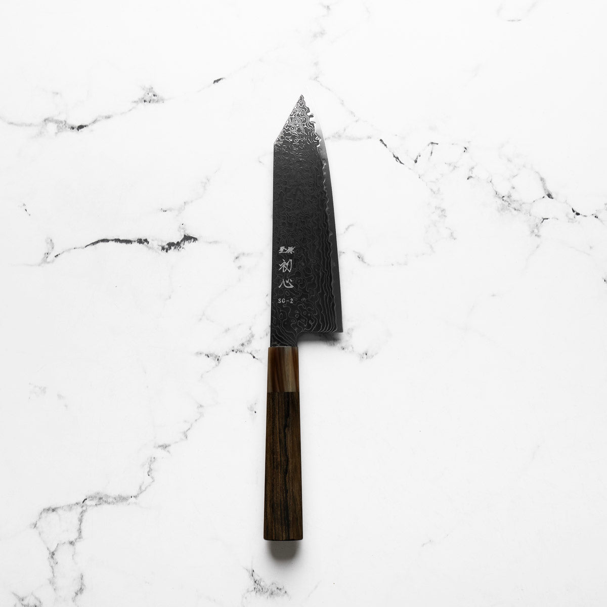 Japanese SG2, also known as R2 steel, is a high-end, powdered metallurgy stainless steel and one of the finest knife-making steels available in Japan. It is a favourite of many for its exceptional hardness and edge retention. Its fine, uniform grain structure enables razor-sharp edges, all the while holding an edge for much longer than Carbon steel knives, without needing to be concerned about rust appearing.