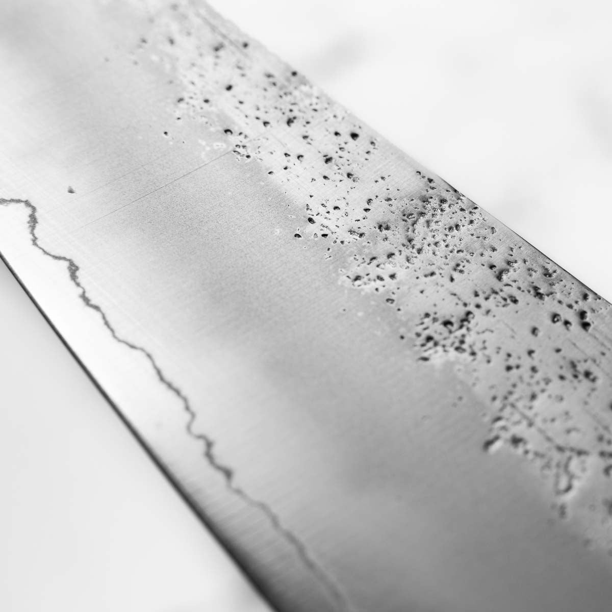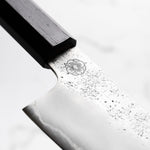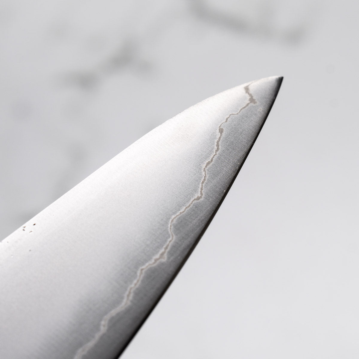 Japanese Ginsan steel, also known as Silver-3 or G3, is an underrated high-grade semi-stainless steel loved by many for being in the ‘goldilocks zone’ of knife steels. It holds a very respectable edge, but is effortless to sharpen. It is considered the semi-stainless version of White 2. It is the knife steel of choice for many home cooks and professional chefs alike.