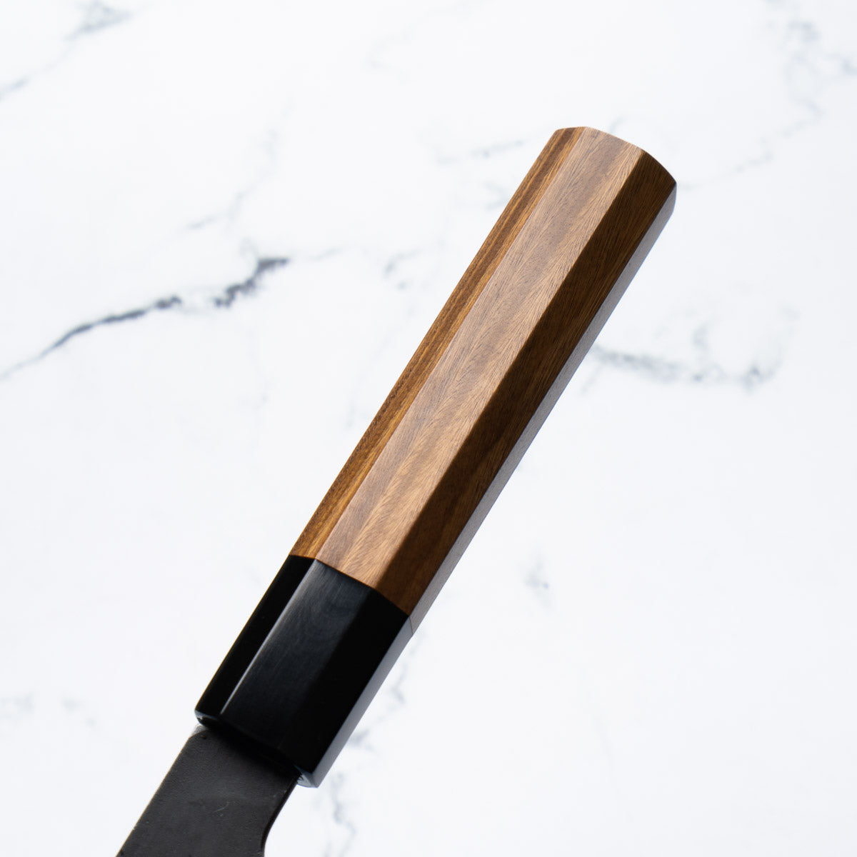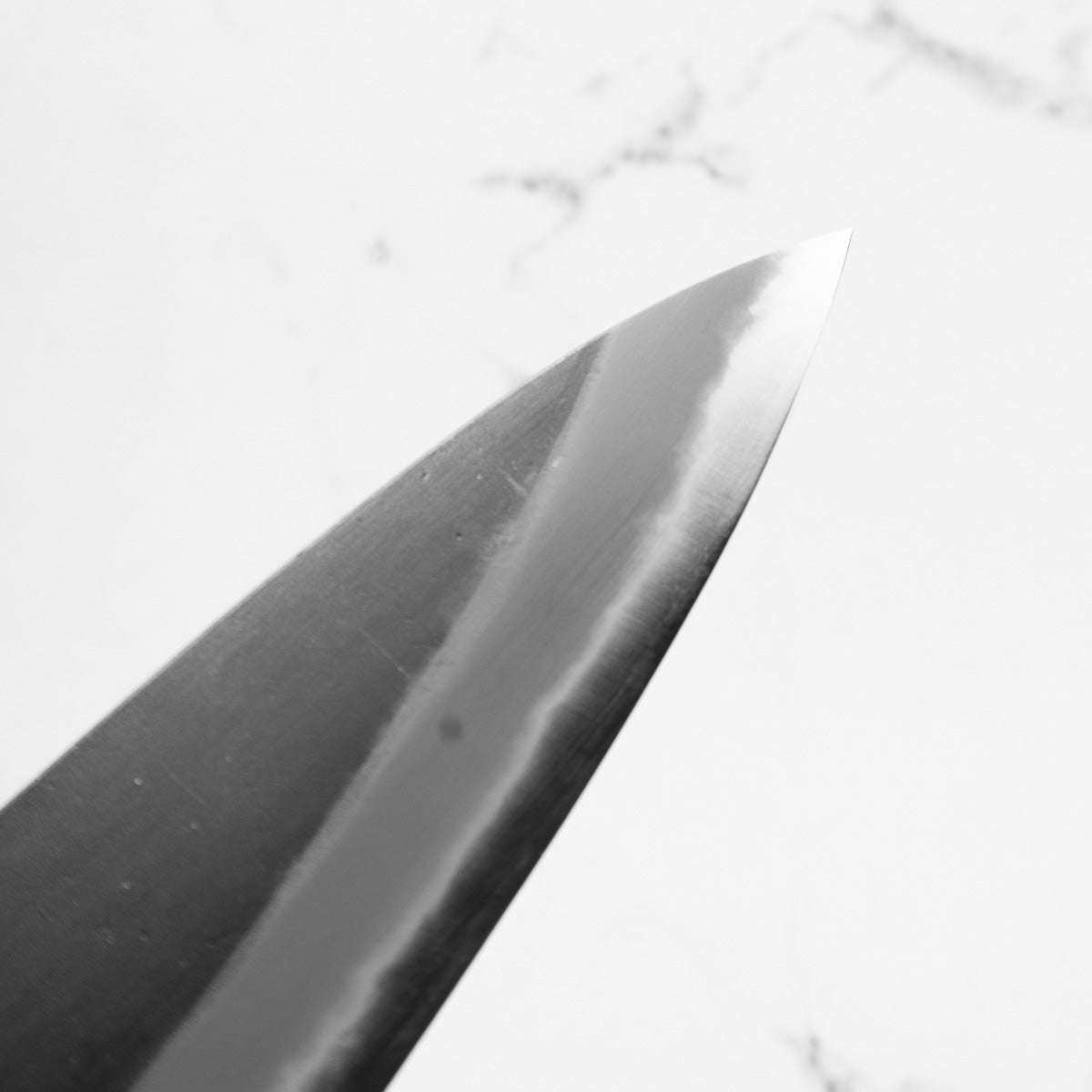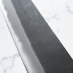 Japanese White Steel #2, a traditional high-carbon steel, is cherished for its purity and fine grain structure, enabling razor-sharp edges, at the cost of being reactive. It is one of the easiest steels to sharpen, but cannot be left wet for even short periods otherwise rust spots can occur. If you’re fastidious in your knife maintenance, this knife steel can be extremely rewarding to use.