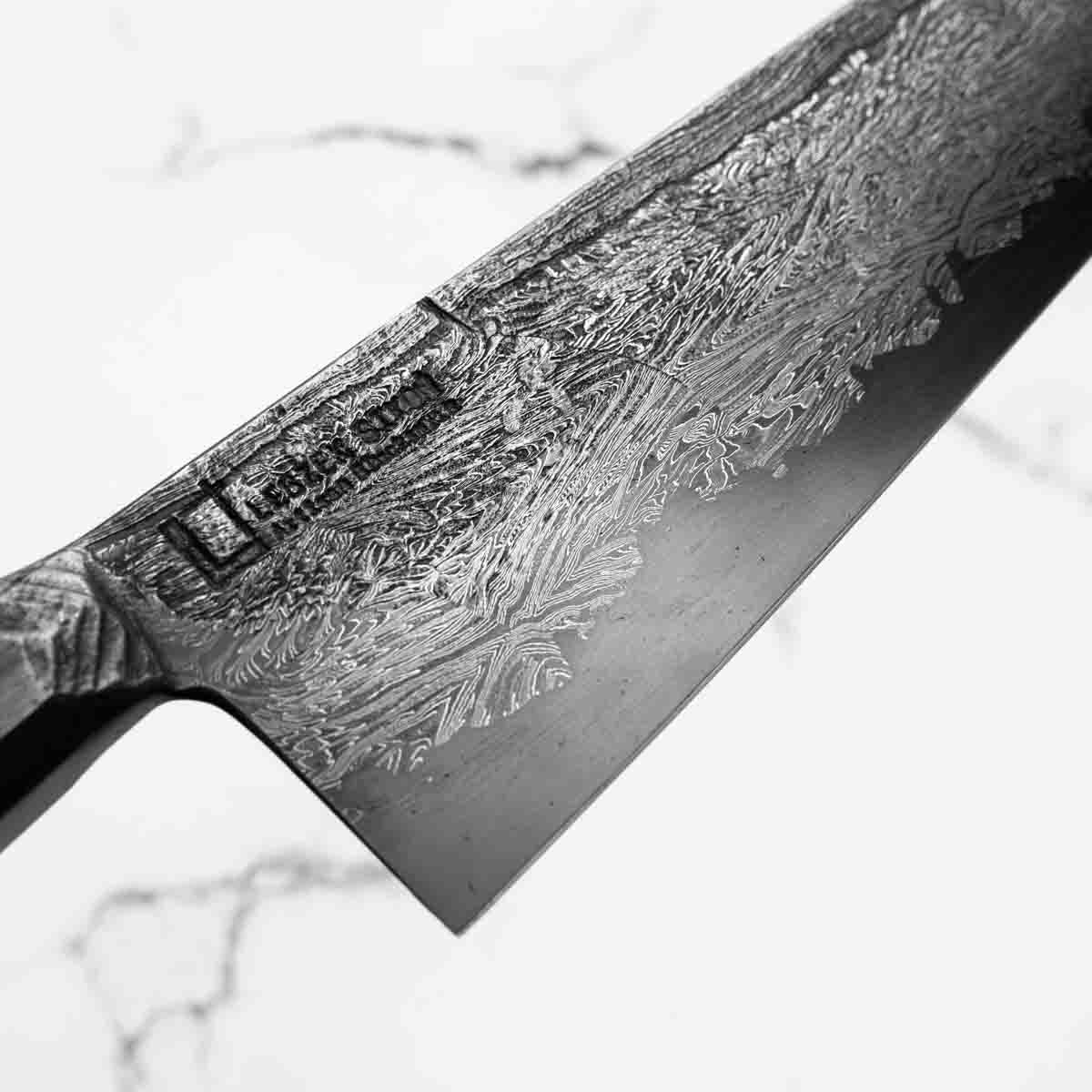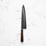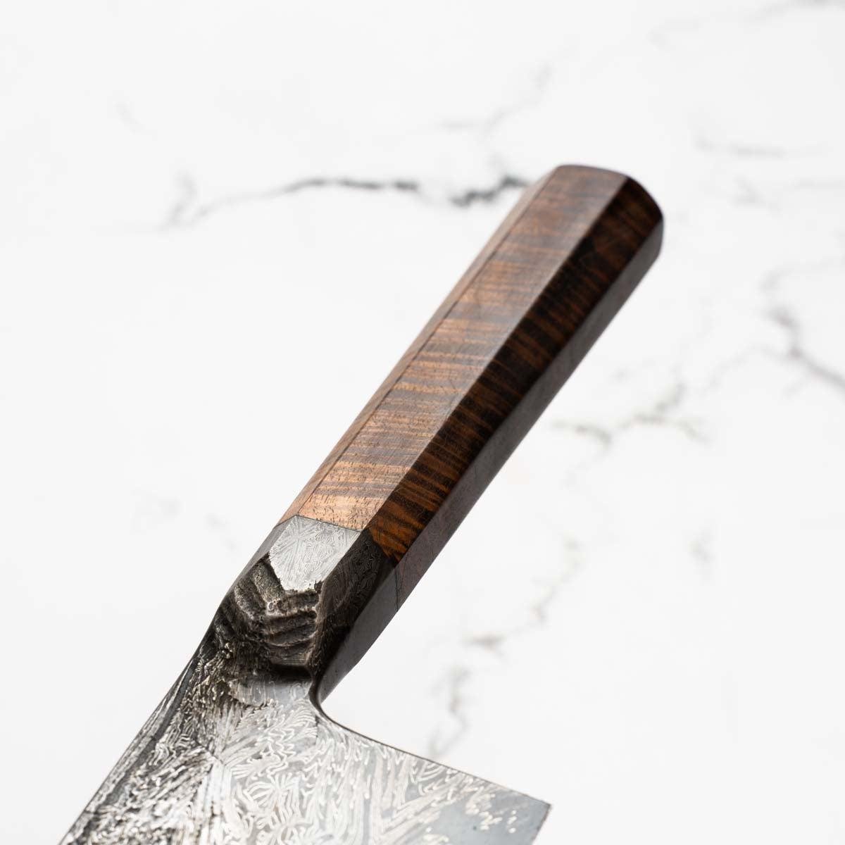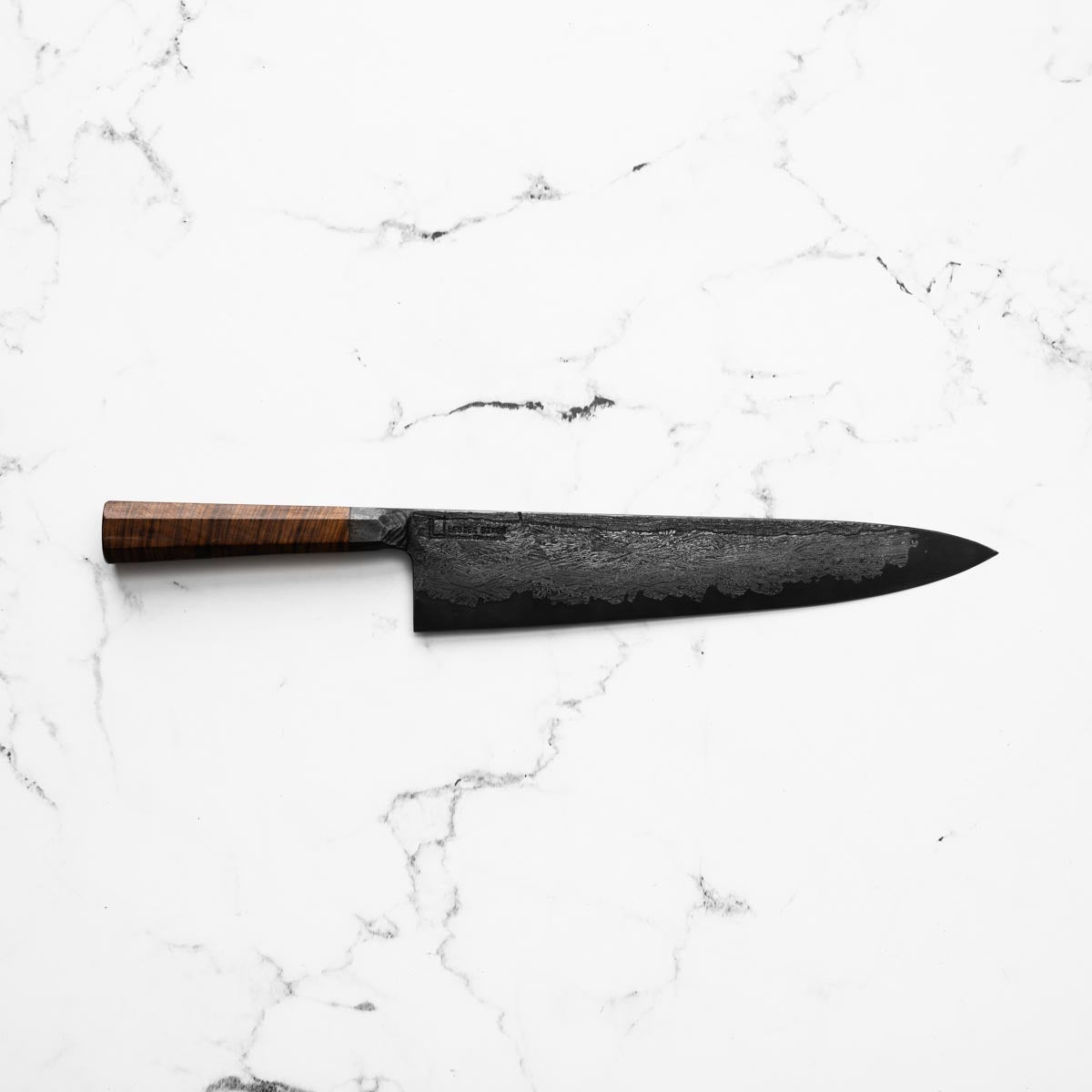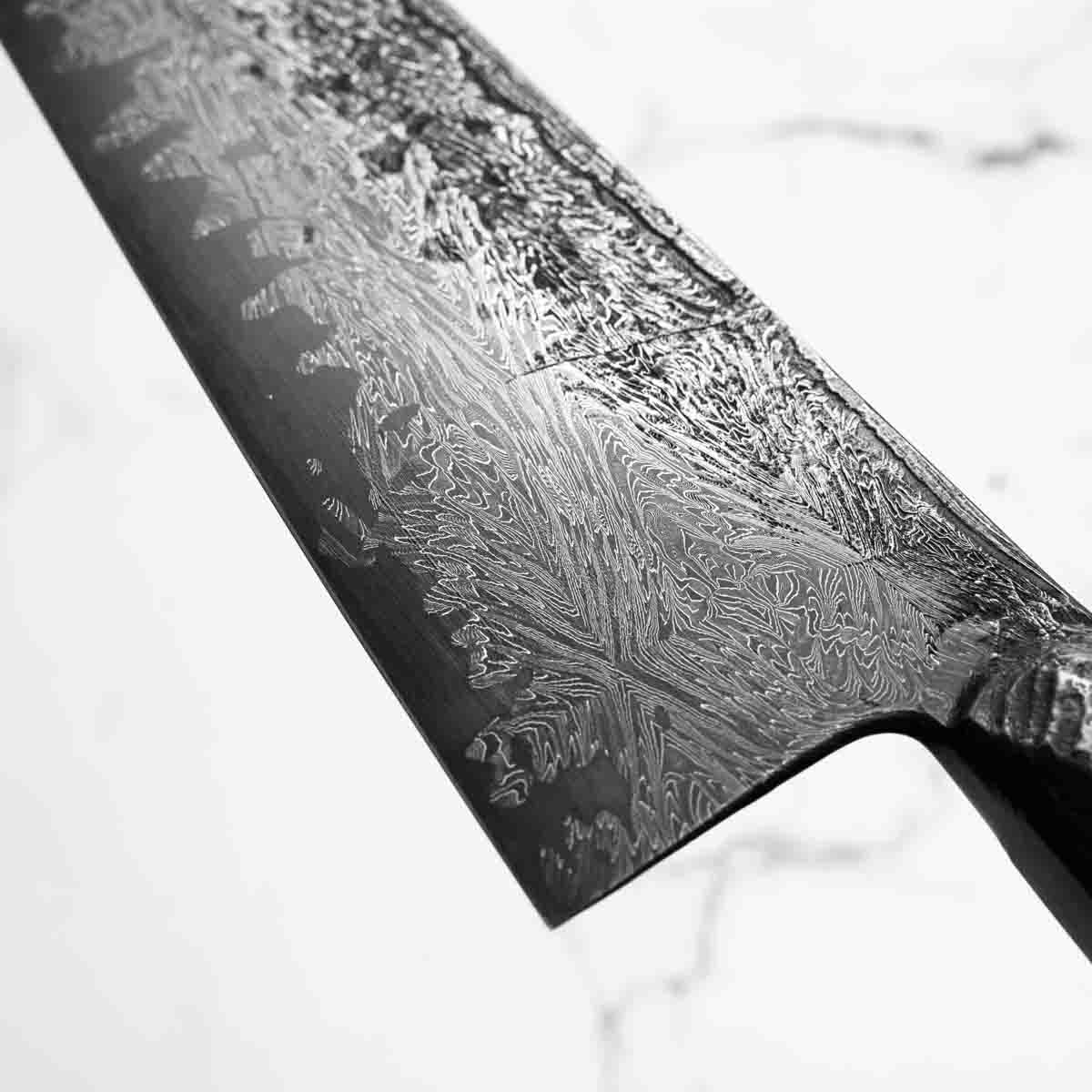 This knife is made from a high-carbon steel and as such, will require a little more care than a regular off-the-shelf knife. It must be dried shortly after use, as prolonged exposure to moisture can cause rust spots to appear. A very light coat of oil during storage also helps to prevent rust spots. A patina (colouration and seasoning of the steel) will occur with use.
