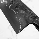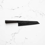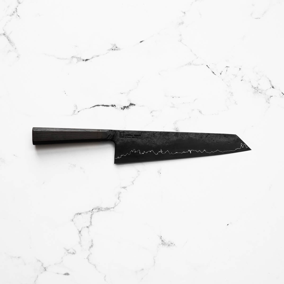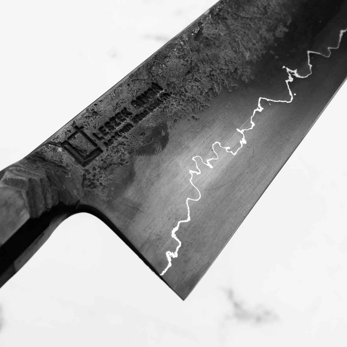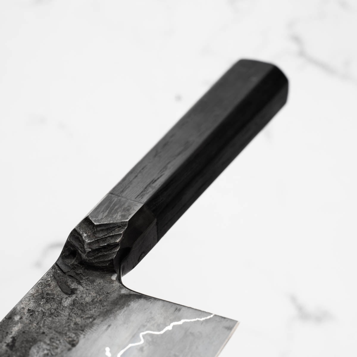 This knife is made from a high-carbon steel and as such, will require a little more care than a regular off-the-shelf knife. It must be dried shortly after use, as prolonged exposure to moisture can cause rust spots to appear. A very light coat of oil during storage also helps to prevent rust spots. A patina (colouration and seasoning of the steel) will occur with use.