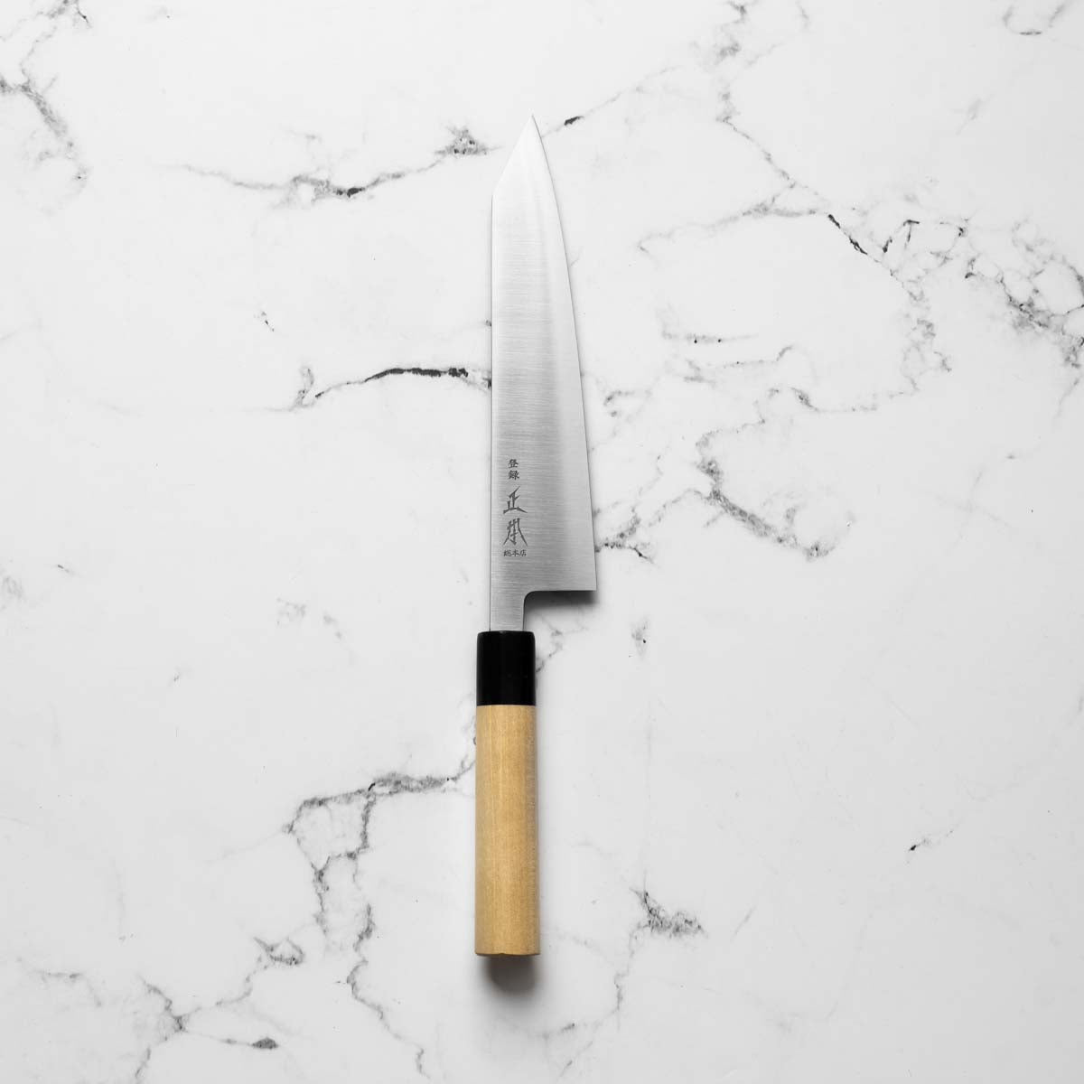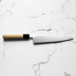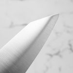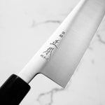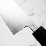 Japanese White Steel #2, a traditional high-carbon steel, is cherished for its purity and fine grain structure, enabling razor-sharp edges, at the cost of being reactive. It is one of the easiest steels to sharpen, but cannot be left wet for even short periods otherwise rust spots can occur. If you’re fastidious in your knife maintenance, this knife steel can be extremely rewarding to use.