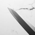 The Yanagiba knife, a staple in traditional Japanese cuisine, is a slender, long-bladed knife primarily used for slicing sashimi and sushi. Its graceful, single-beveled edge guarantees precise, thin cuts, preserving the texture and integrity of the fish. Revered for its sharpness and balance, the Yanagiba is essential for authentic Japanese food preparation.