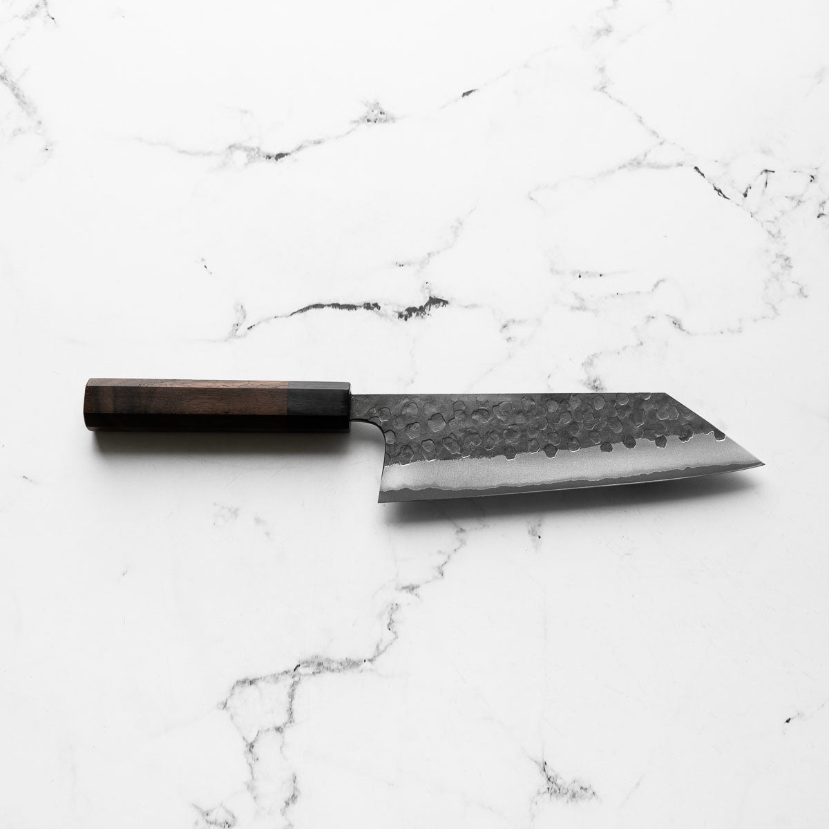 This knife is made from a high-carbon steel and as such, will require a little more care than a regular off-the-shelf knife. It must be dried shortly after use, as prolonged exposure to moisture can cause rust spots to appear. A very light coat of oil during storage also helps to prevent rust spots. A patina (colouration and seasoning of the steel) will occur with use.