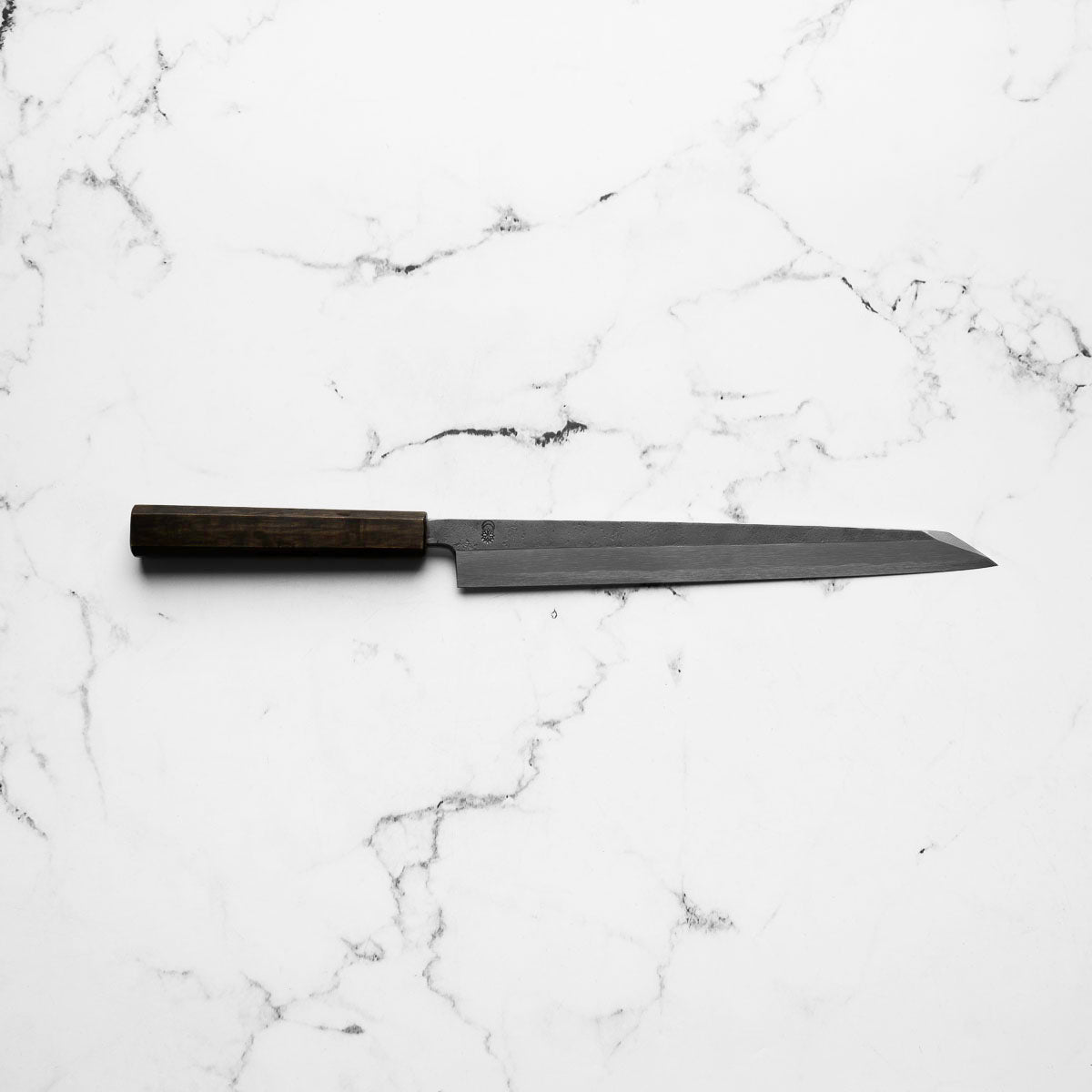 The Yanagiba knife, a staple in traditional Japanese cuisine, is a slender, long-bladed knife primarily used for slicing sashimi and sushi. Its graceful, single-beveled edge guarantees precise, thin cuts, preserving the texture and integrity of the fish. Revered for its sharpness and balance, the Yanagiba is essential for authentic Japanese food preparation.