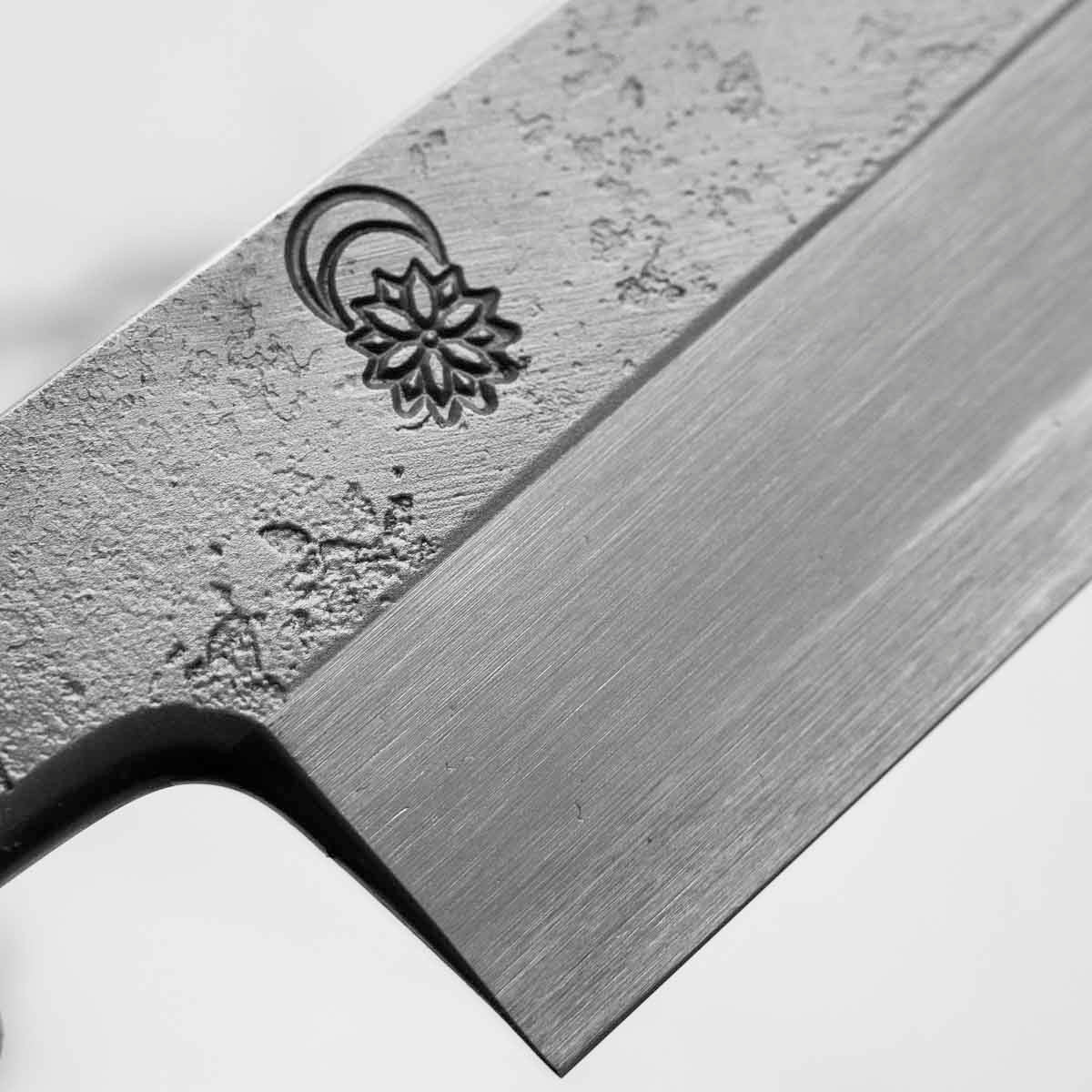 Japanese White Steel #2, a traditional high-carbon steel, is cherished for its purity and fine grain structure, enabling razor-sharp edges, at the cost of being reactive. It is one of the easiest steels to sharpen, but cannot be left wet for even short periods otherwise rust spots can occur. If you’re fastidious in your knife maintenance, this knife can steel can be extremely rewarding to use.