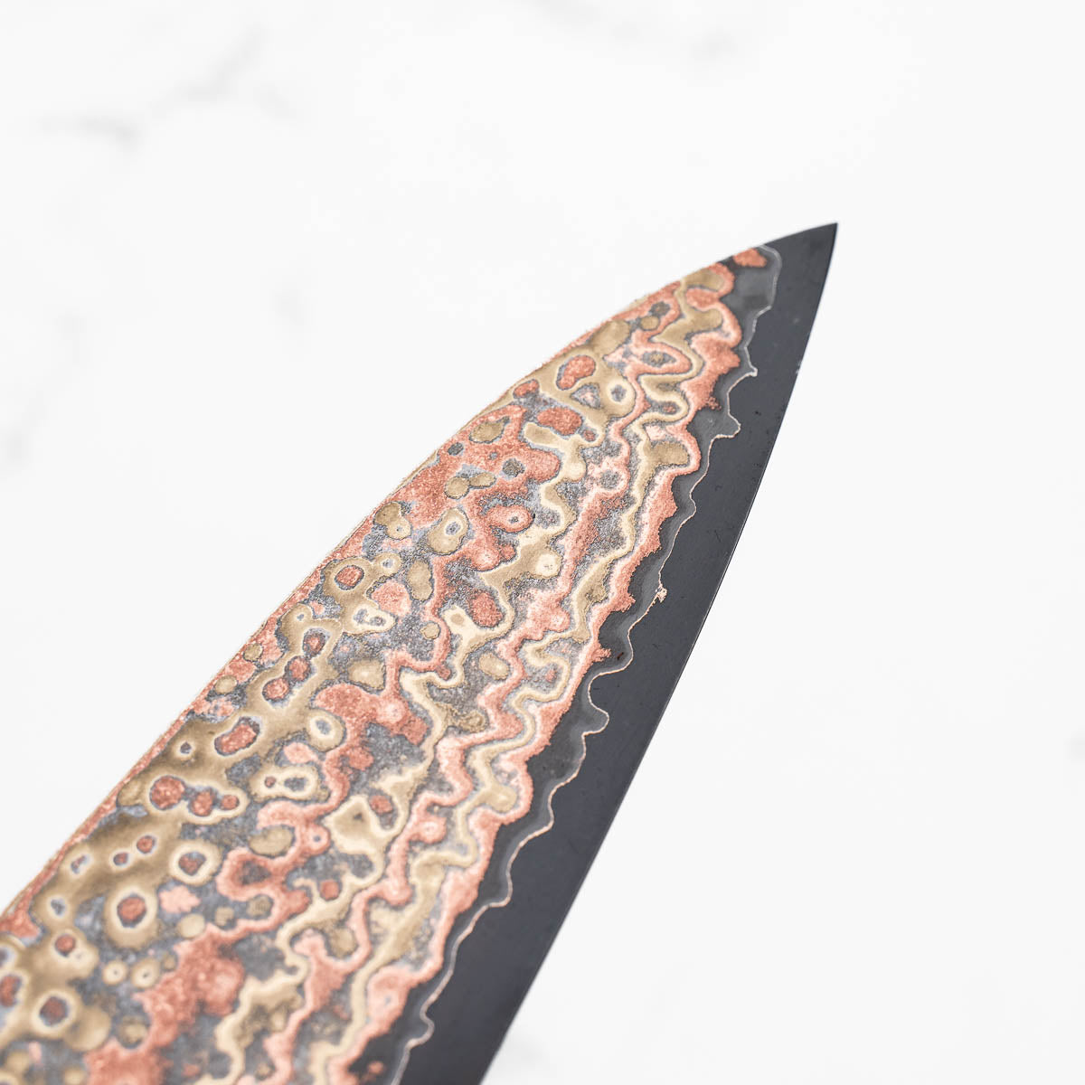 This knife is made from a high-carbon steel and as such, will require a little more care than a regular off-the-shelf knife. It must be dried shortly after use, as prolonged exposure to moisture can cause rust spots to appear. A very light coat of oil during storage also helps to prevent rust spots. A patina (colouration and seasoning of the steel) will occur with use.