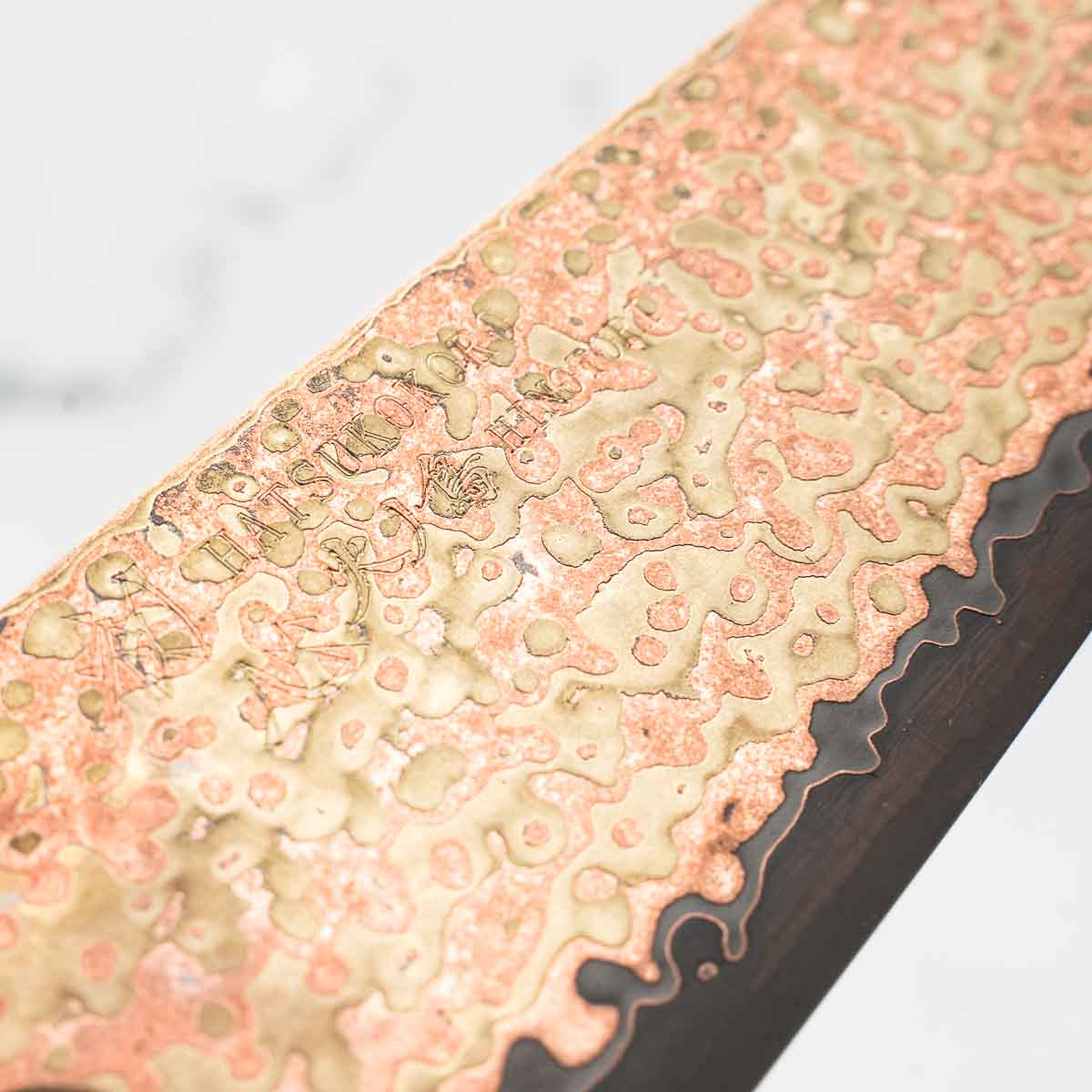 This knife is made from a high-carbon steel and as such, will require a little more care than a regular off-the-shelf knife. It must be dried shortly after use, as prolonged exposure to moisture can cause rust spots to appear. A very light coat of oil during storage also helps to prevent rust spots. A patina (colouration and seasoning of the steel) will occur with use.