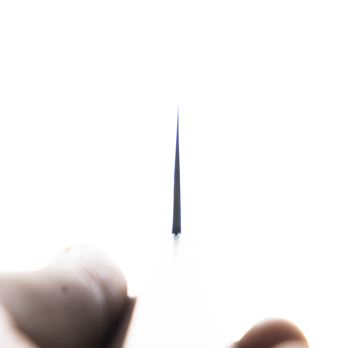 Japanese White Steel #2, a traditional high-carbon steel, is cherished for its purity and fine grain structure, enabling razor-sharp edges, at the cost of being reactive. It is one of the easiest steels to sharpen, but cannot be left wet for even short periods otherwise rust spots can occur. If you’re fastidious in your knife maintenance, this knife steel can be extremely rewarding to use.