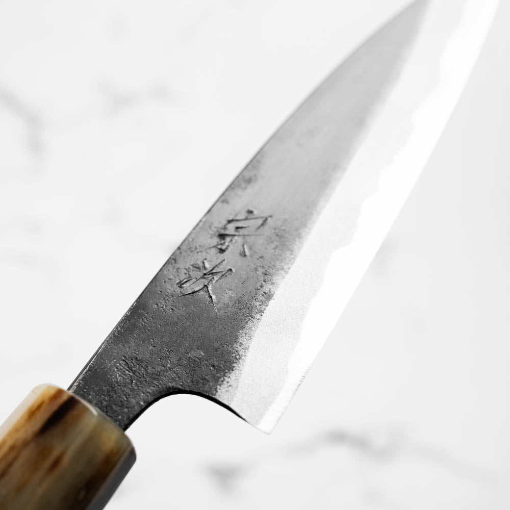 This knife is made from a high-carbon steel and as such, will require a little more care than a regular off-the-shelf knife. It must be dried shortly after use, as prolonged exposure to moisture can cause rust spots to appear. A very light coat of oil during storage also helps to prevent rust spots. A patina (colouration and seasoning of the steel) will occur with use.