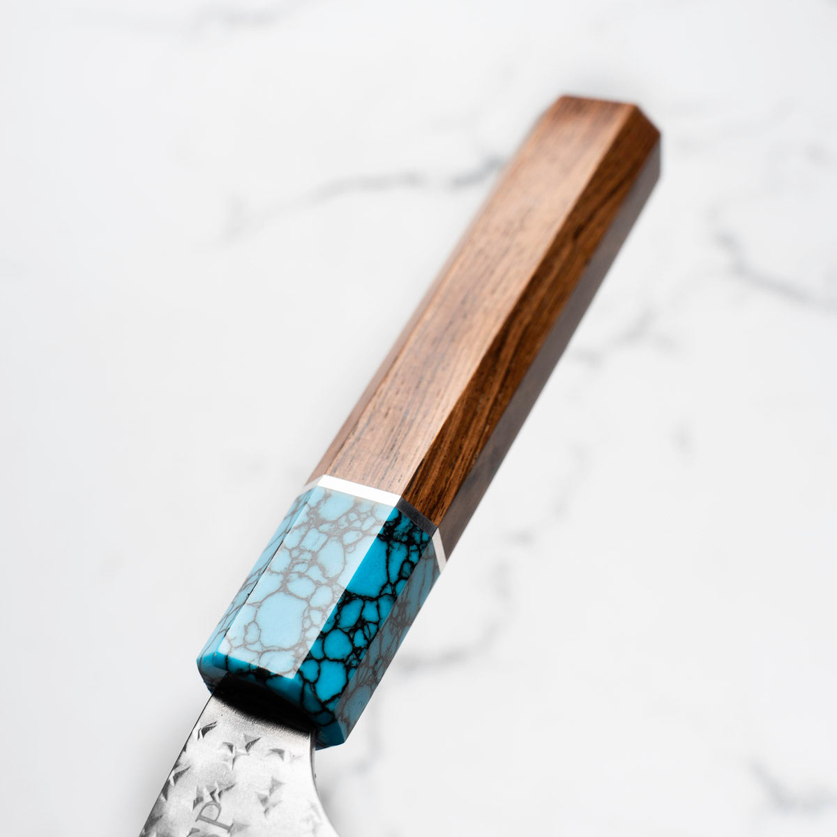 His knives are instantly recognizable for their striking Tsuchime and Suminagashi finishes, thin grinds, and use of high-performance steels such as SG2, HAP40, and stainless-clad Blue Super. Kurosaki’s Fujin series, with its dramatic wind-patterned hammer finish, helped cement his reputation as a blacksmith who blends artistry and technical brilliance in equal measure.