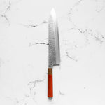 His knives are instantly recognizable for their striking Tsuchime and Suminagashi finishes, thin grinds, and use of high-performance steels such as SG2, HAP40, and stainless-clad Blue Super. Kurosaki’s Fujin series, with its dramatic wind-patterned hammer finish, helped cement his reputation as a blacksmith who blends artistry and technical brilliance in equal measure.
