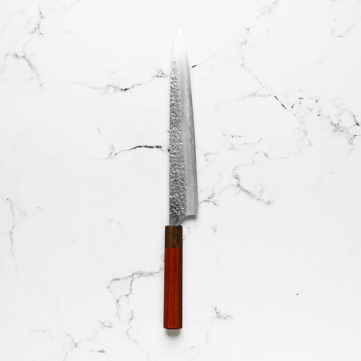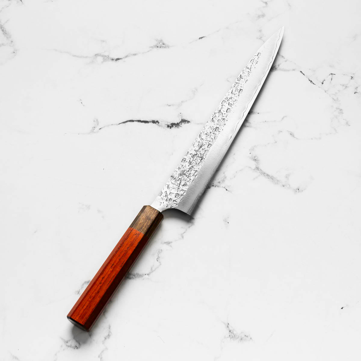 The Sujihiki knife, a traditional Japanese slicer, is designed for carving and fileting. With its long, narrow blade, typically ranging from 240mm to 330mm, it excels in creating clean, smooth cuts through meat and fish. Its length ensures long, uninterrupted strokes, making it perfect for precise slicing tasks.