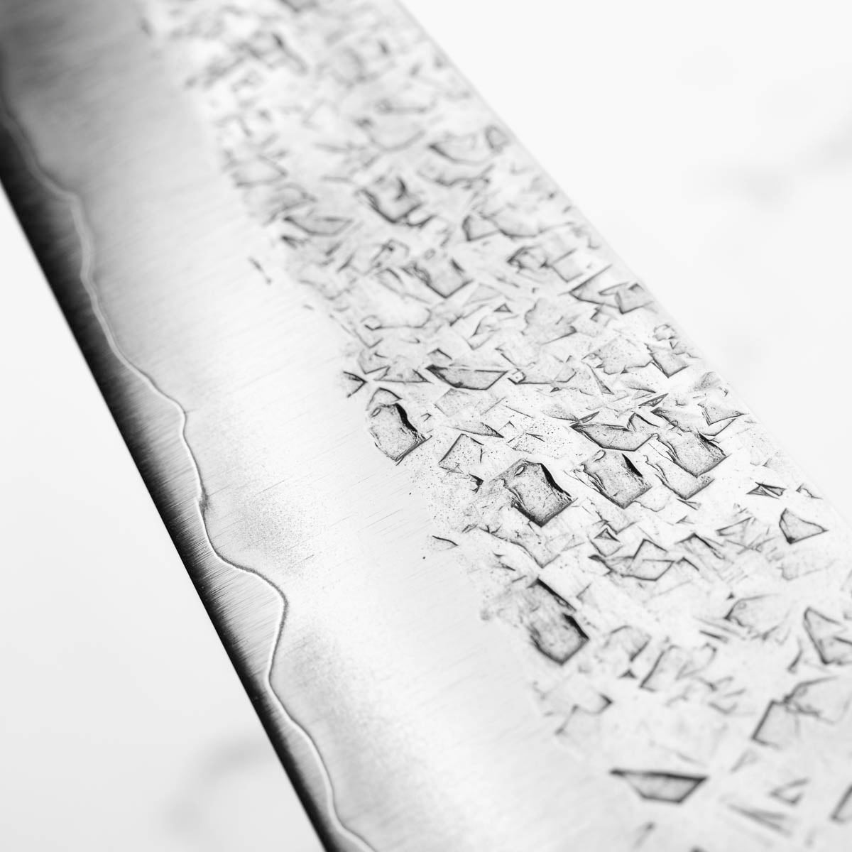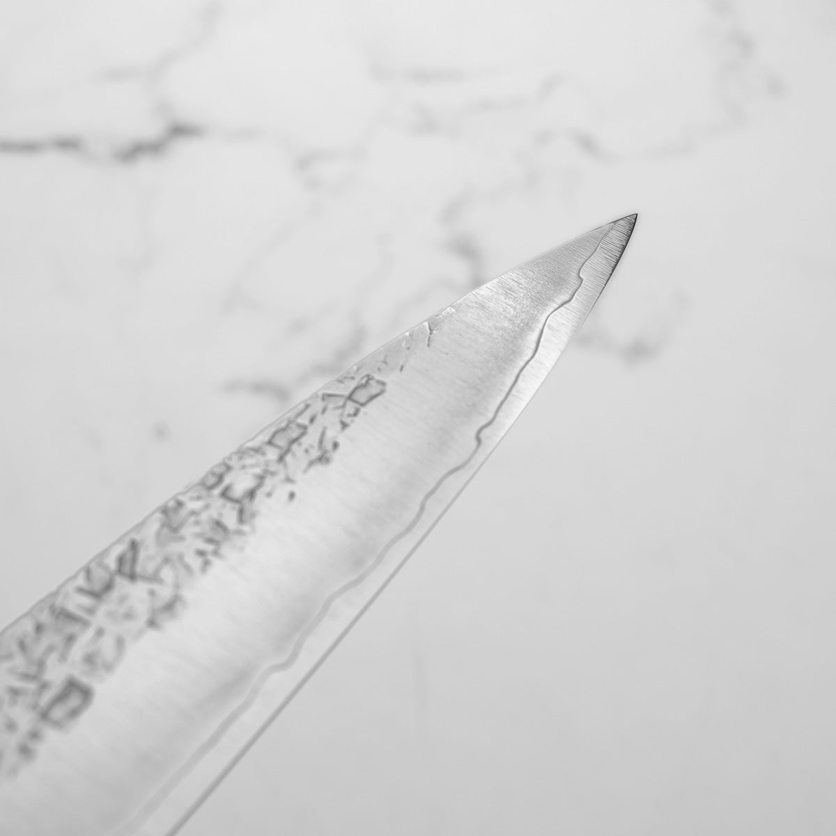 His knives are instantly recognizable for their striking Tsuchime and Suminagashi finishes, thin grinds, and use of high-performance steels such as SG2, HAP40, and stainless-clad Blue Super. Kurosaki’s Fujin series, with its dramatic wind-patterned hammer finish, helped cement his reputation as a blacksmith who blends artistry and technical brilliance in equal measure.