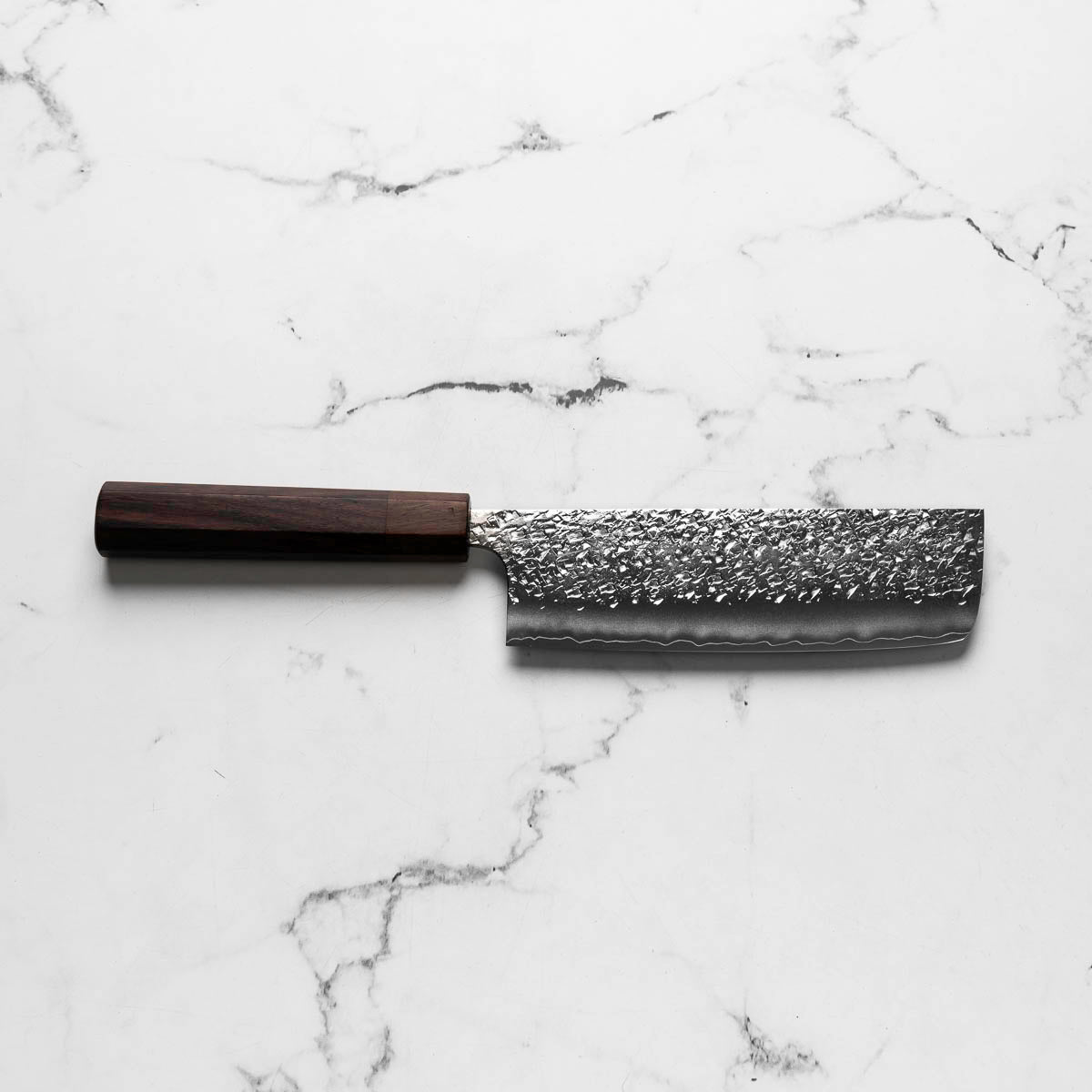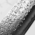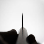 His knives are instantly recognizable for their striking Tsuchime and Suminagashi finishes, thin grinds, and use of high-performance steels such as SG2, HAP40, and stainless-clad Blue Super. Kurosaki’s Fujin series, with its dramatic wind-patterned hammer finish, helped cement his reputation as a blacksmith who blends artistry and technical brilliance in equal measure.