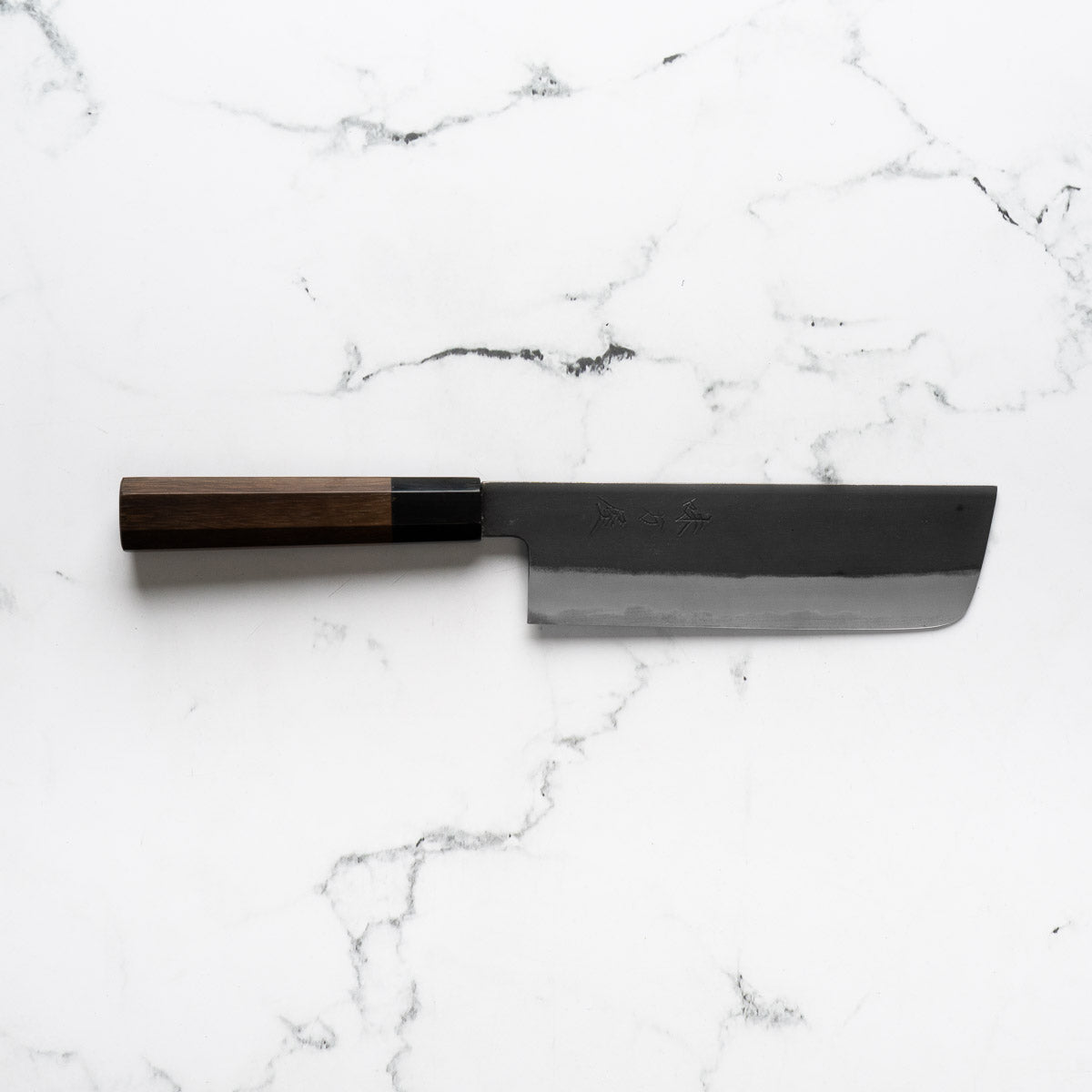 This knife is made from a high-carbon steel and as such, will require a little more care than a regular off-the-shelf knife. It must be dried shortly after use, as prolonged exposure to moisture can cause rust spots to appear. A very light coat of oil during storage also helps to prevent rust spots. A patina (colouration and seasoning of the steel) will occur with use.