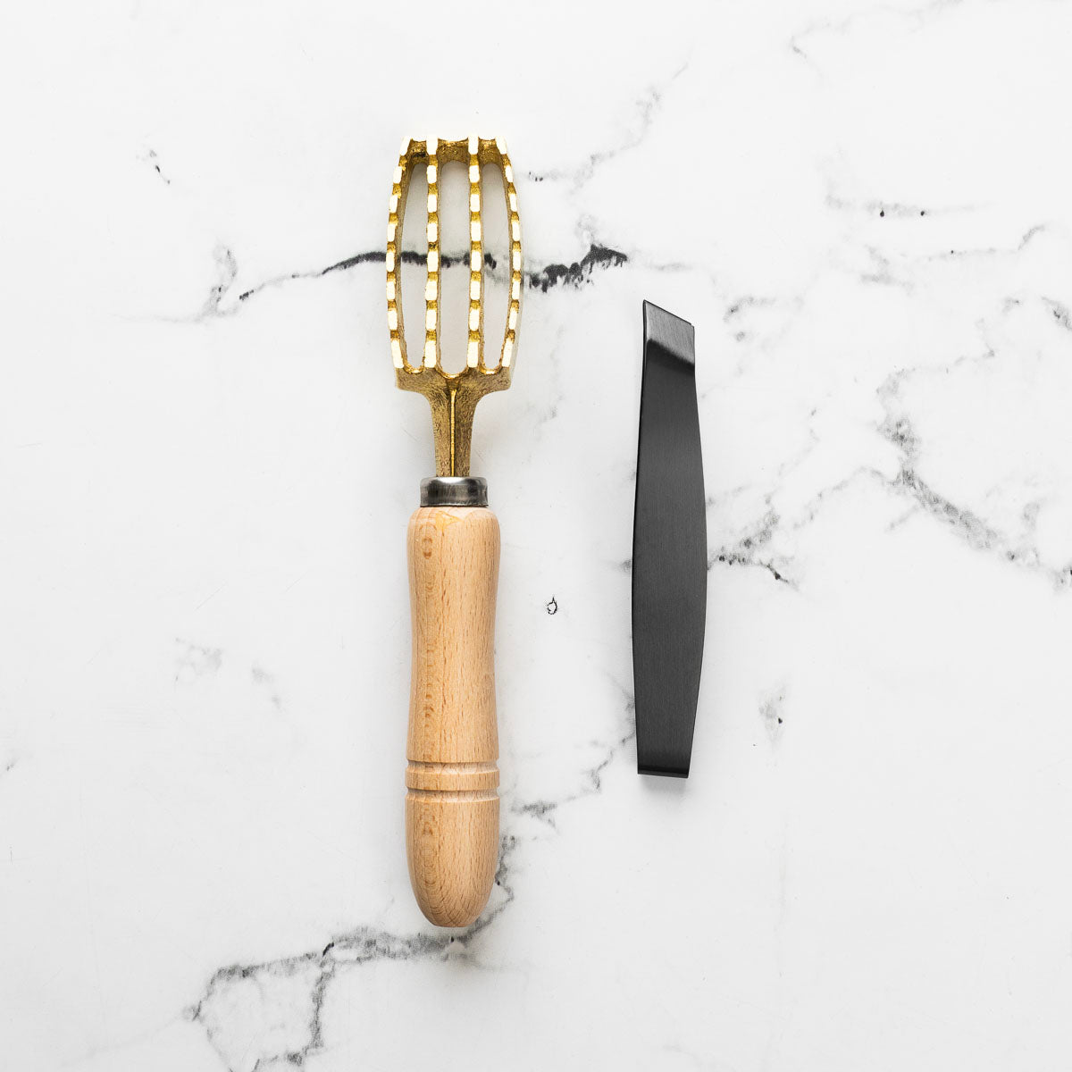 Includes the large brass fish scaler and matte black brushed fish bone tweezers