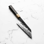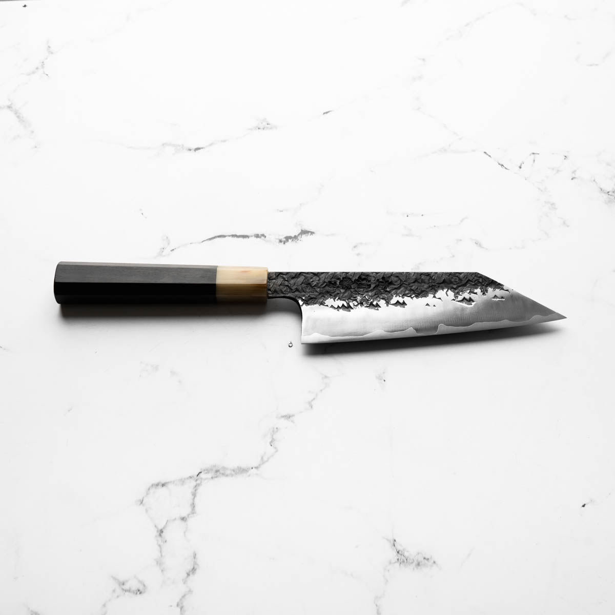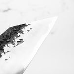 Embracing a rapid rise in popularity for his unique designs and committment to striving for perfection, Shunsuke Manaka is the man behind Kisuke knives. From the sketchbook to the kitchen, he is the sole craftsman behind the entire knifemaking process. Shunsuke engineers these knives using a process known as Warikomi, whereby a glowing hot piece of steel is split, and the core steel is wedged in and forged together. The split steel becomes the outer layers, and the core steel is exposed at the edge. This process produces a stronger, tougher more durable blade.