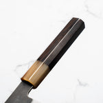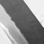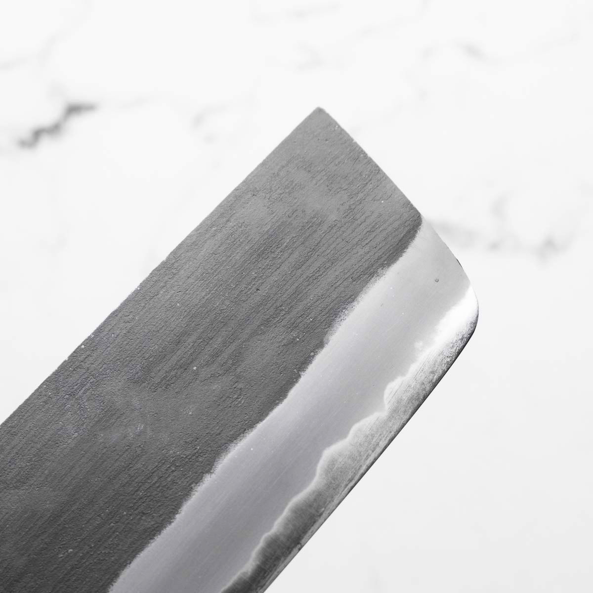Japanese White Steel #2, a traditional high-carbon steel, is cherished for its purity and fine grain structure, enabling razor-sharp edges, at the cost of being reactive. It is one of the easiest steels to sharpen, but cannot be left wet for even short periods otherwise rust spots can occur. If you’re fastidious in your knife maintenance, this knife steel can be extremely rewarding to use.