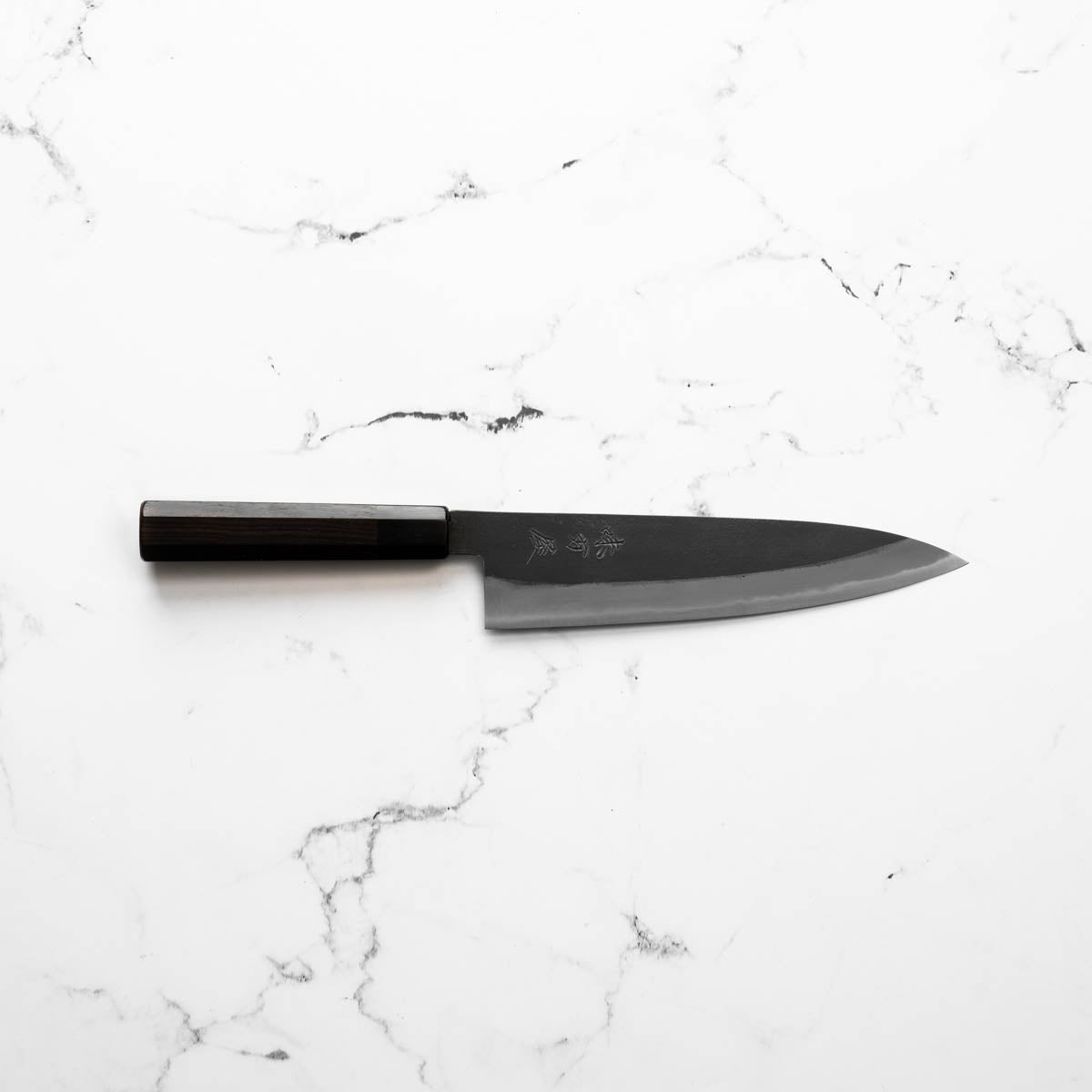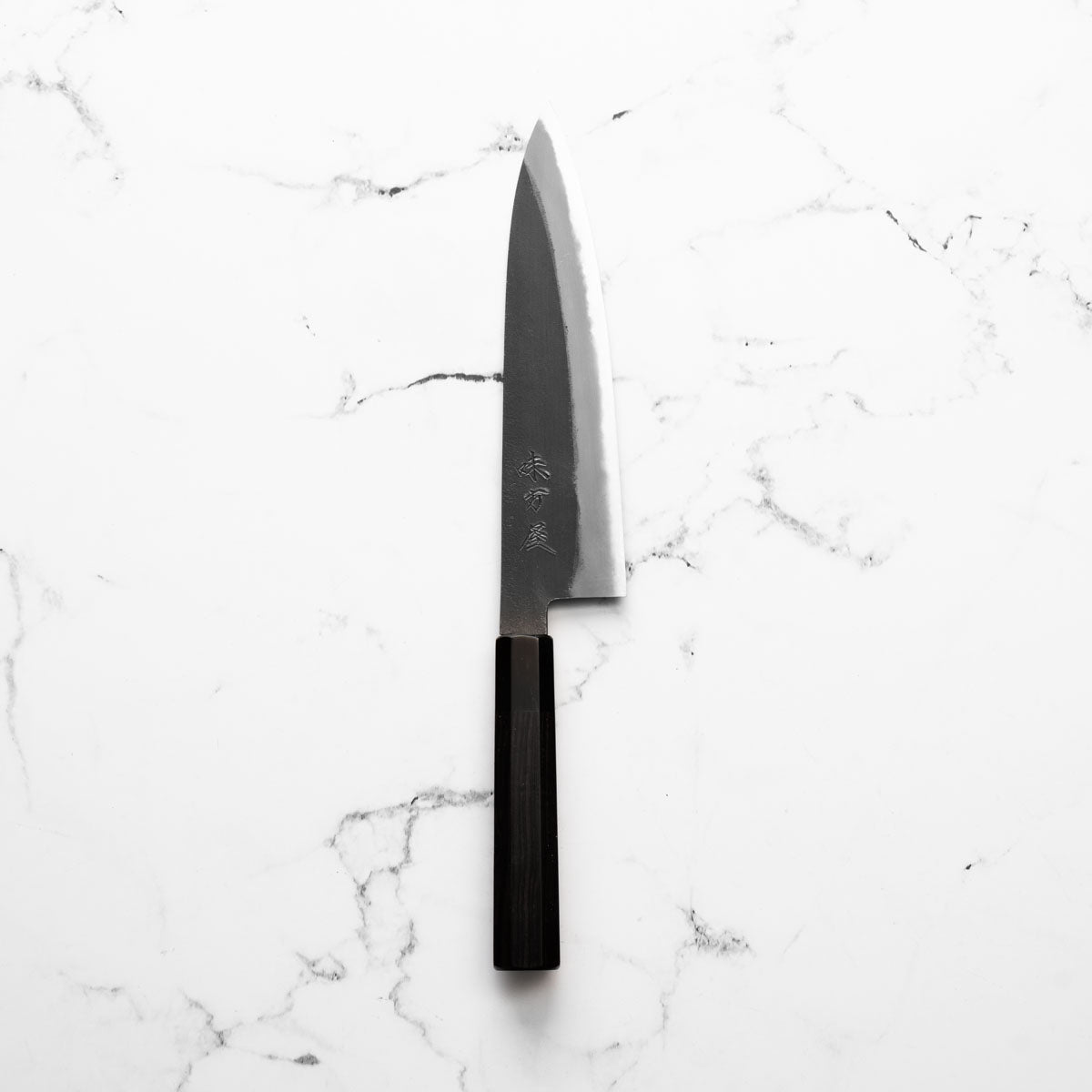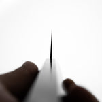 Japanese White Steel #2, a traditional high-carbon steel, is cherished for its purity and fine grain structure, enabling razor-sharp edges, at the cost of being reactive. It is one of the easiest steels to sharpen, but cannot be left wet for even short periods otherwise rust spots can occur. If you’re fastidious in your knife maintenance, this knife steel can be extremely rewarding to use.