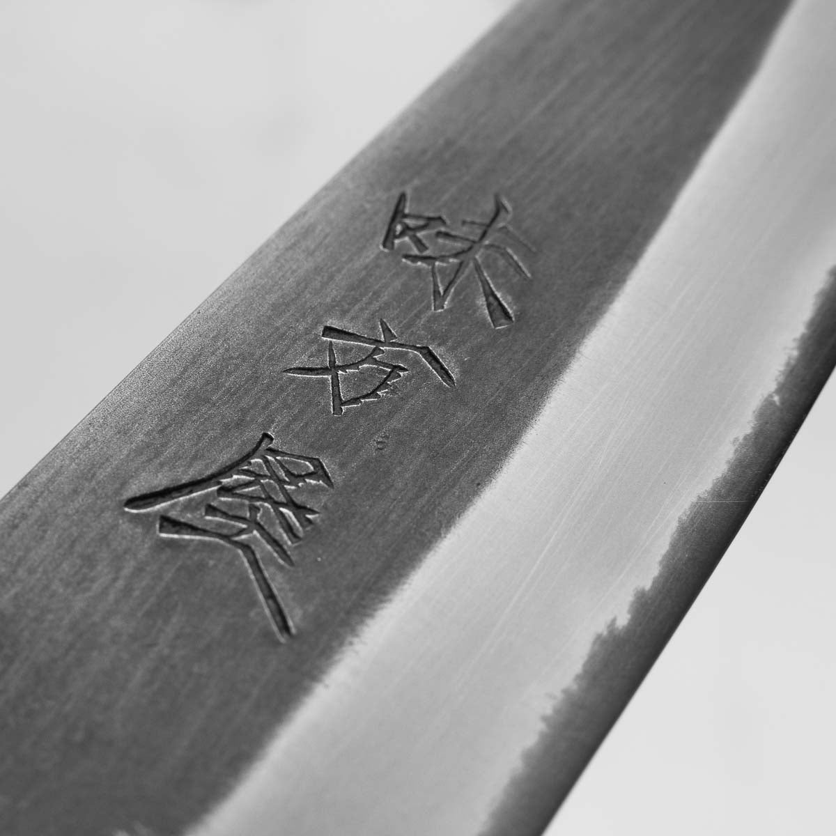 Japanese White Steel #2, a traditional high-carbon steel, is cherished for its purity and fine grain structure, enabling razor-sharp edges, at the cost of being reactive. It is one of the easiest steels to sharpen, but cannot be left wet for even short periods otherwise rust spots can occur. If you’re fastidious in your knife maintenance, this knife steel can be extremely rewarding to use.