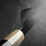 Japanese White Steel #2, a traditional high-carbon steel, is cherished for its purity and fine grain structure, enabling razor-sharp edges, at the cost of being reactive. It is one of the easiest steels to sharpen, but cannot be left wet for even short periods otherwise rust spots can occur. If you’re fastidious in your knife maintenance, this knife steel can be extremely rewarding to use.