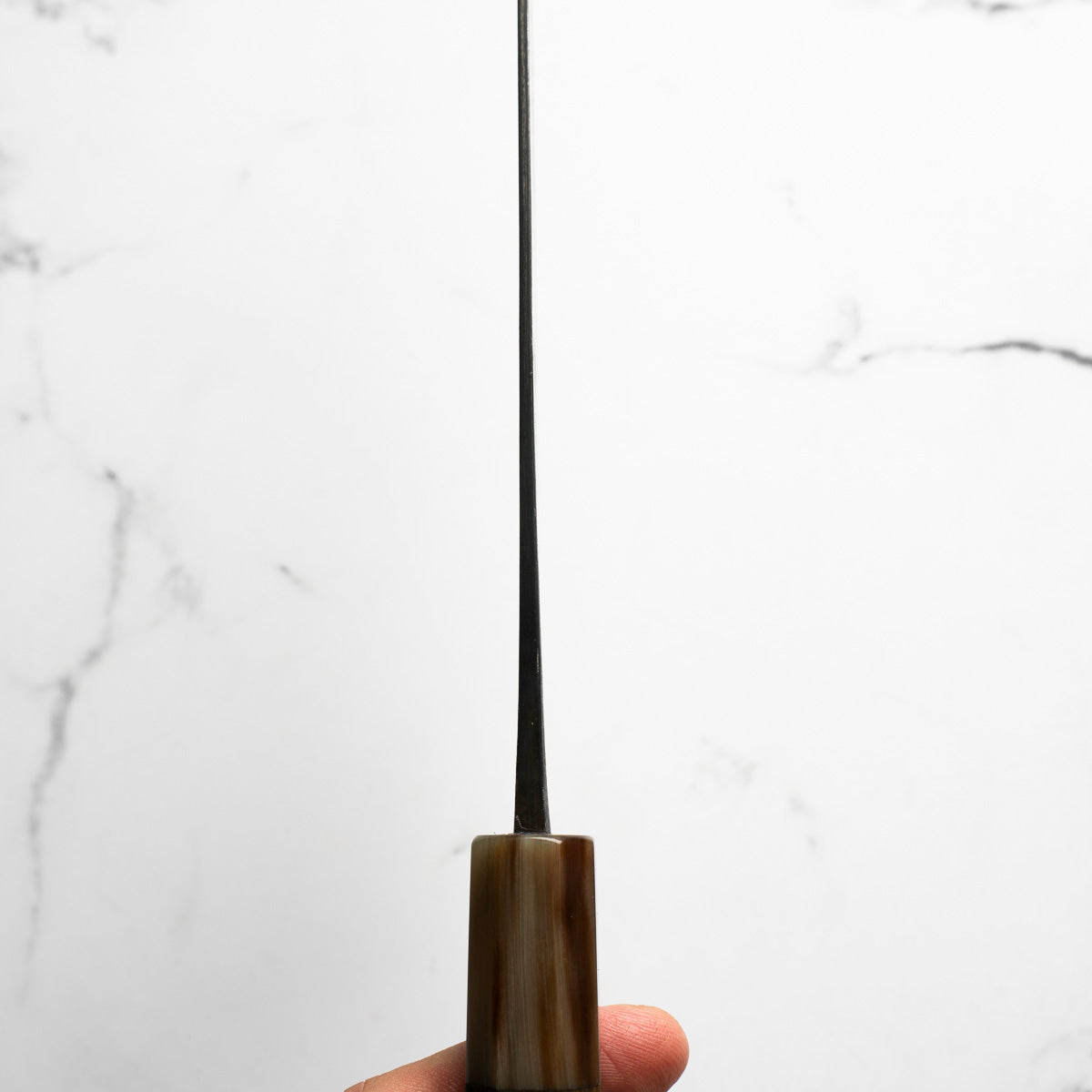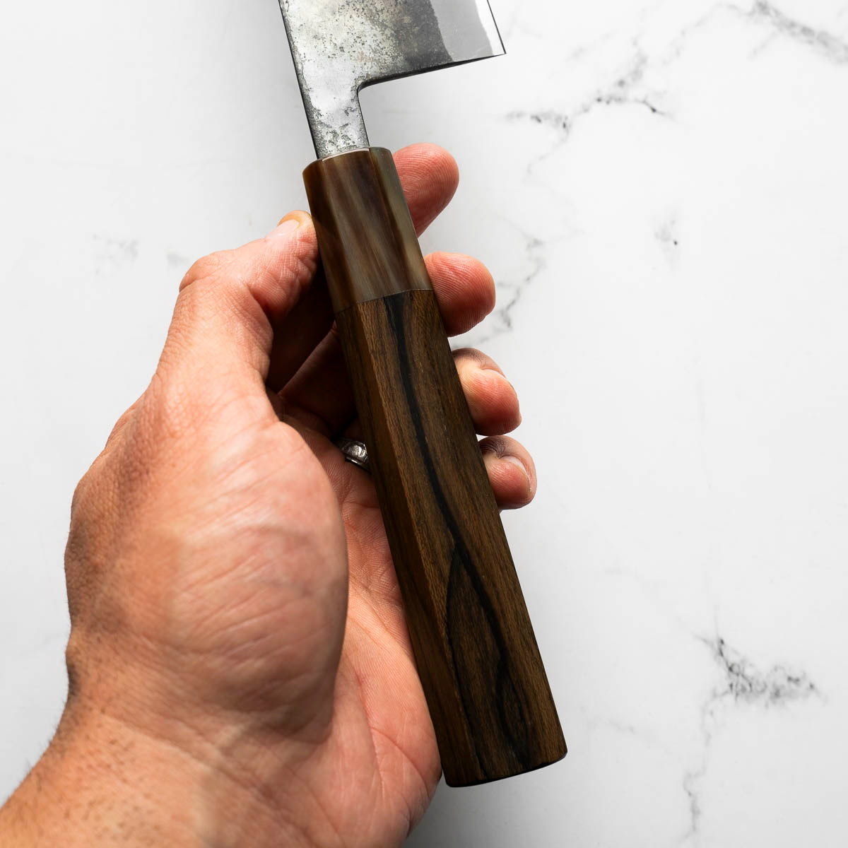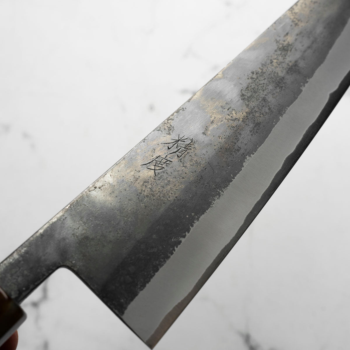 Japanese White Steel #2, a traditional high-carbon steel, is cherished for its purity and fine grain structure, enabling razor-sharp edges, at the cost of being reactive. It is one of the easiest steels to sharpen, but cannot be left wet for even short periods otherwise rust spots can occur. If you’re fastidious in your knife maintenance, this knife steel can be extremely rewarding to use.