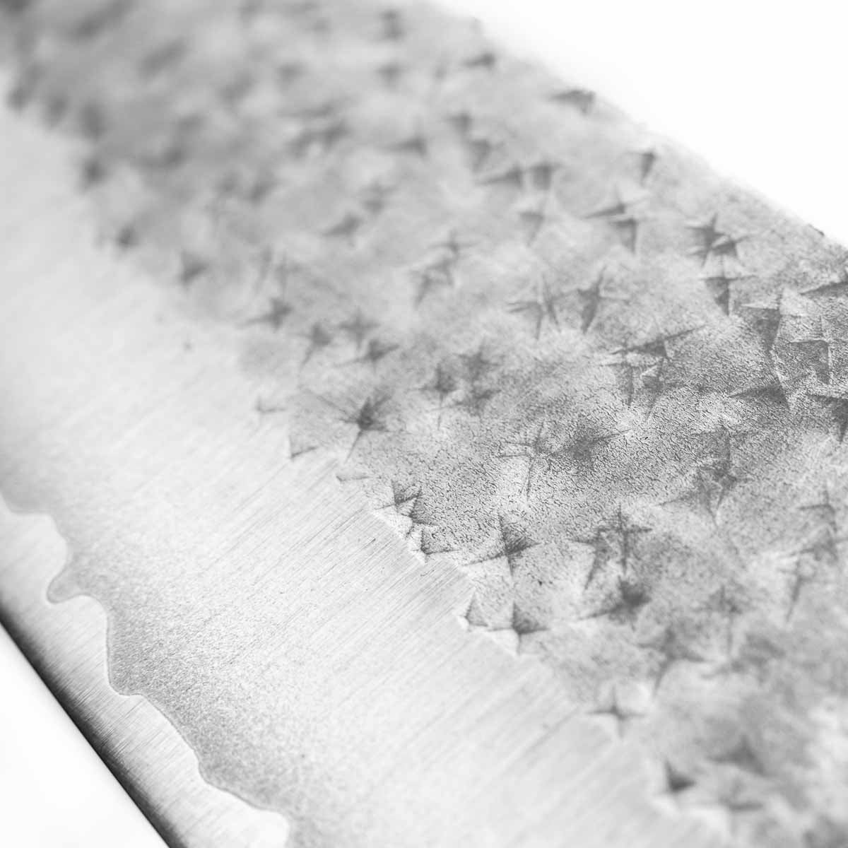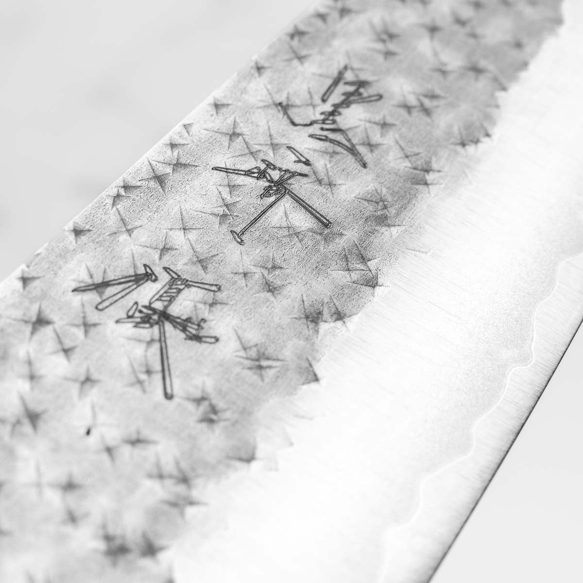 His knives are instantly recognizable for their striking Tsuchime and Suminagashi finishes, thin grinds, and use of high-performance steels such as SG2, HAP40, and stainless-clad Blue Super. Kurosaki’s Fujin series, with its dramatic wind-patterned hammer finish, helped cement his reputation as a blacksmith who blends artistry and technical brilliance in equal measure.