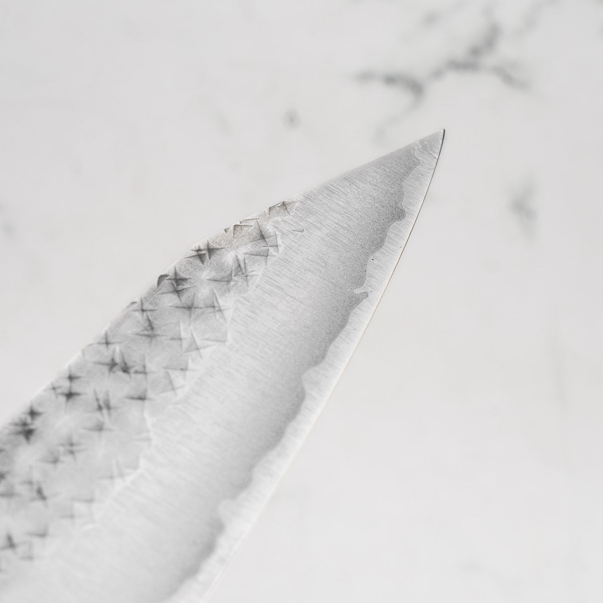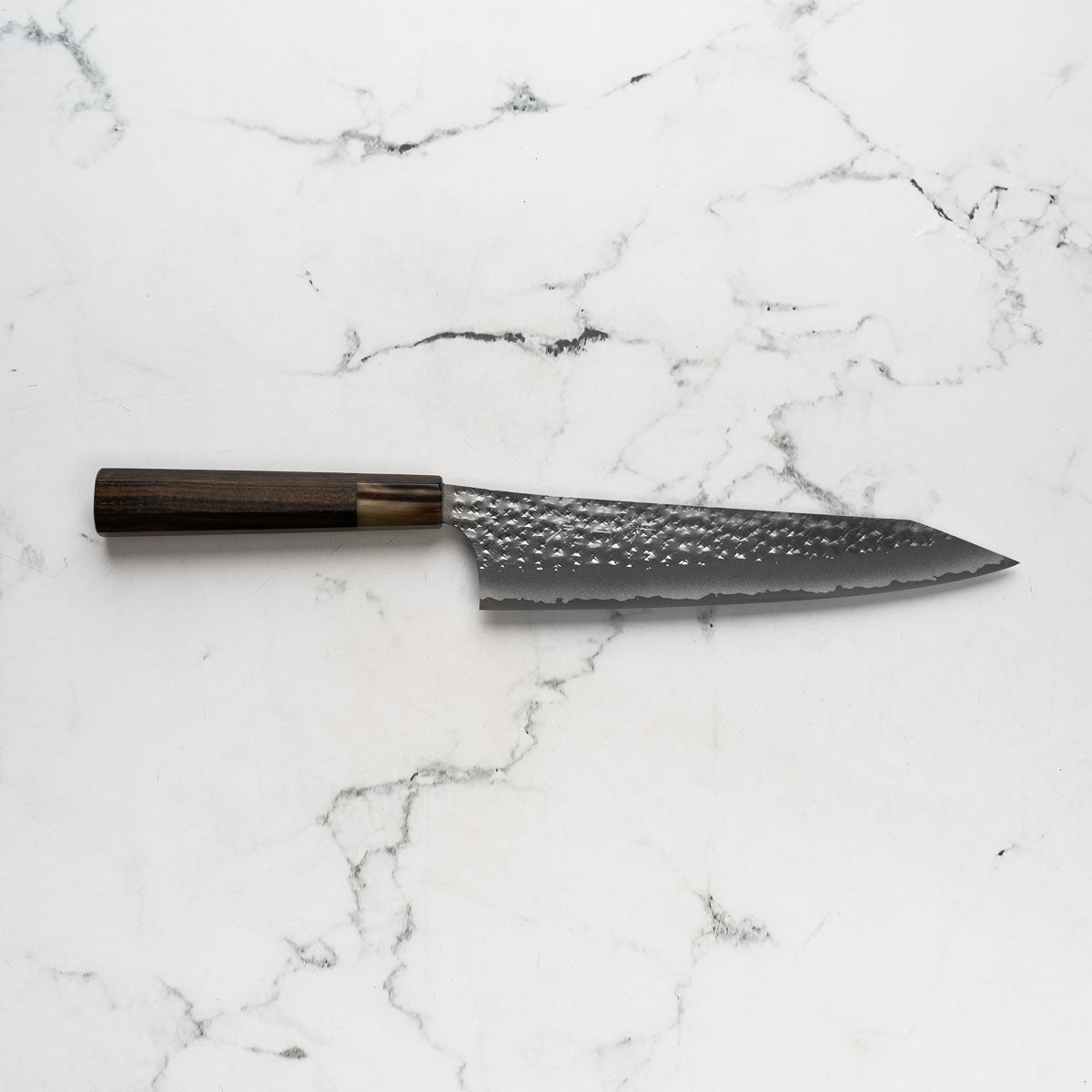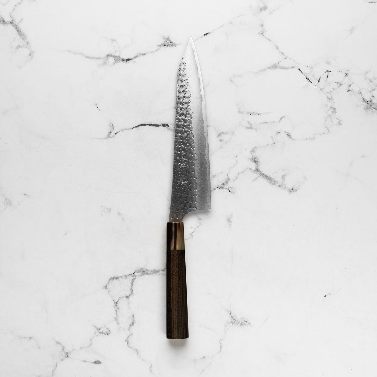 His knives are instantly recognizable for their striking Tsuchime and Suminagashi finishes, thin grinds, and use of high-performance steels such as SG2, HAP40, and stainless-clad Blue Super. Kurosaki’s Fujin series, with its dramatic wind-patterned hammer finish, helped cement his reputation as a blacksmith who blends artistry and technical brilliance in equal measure.
