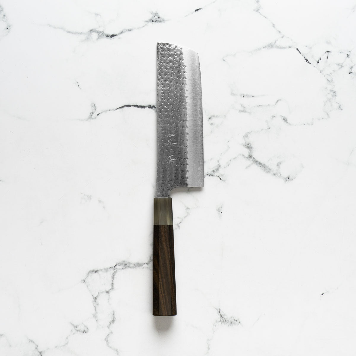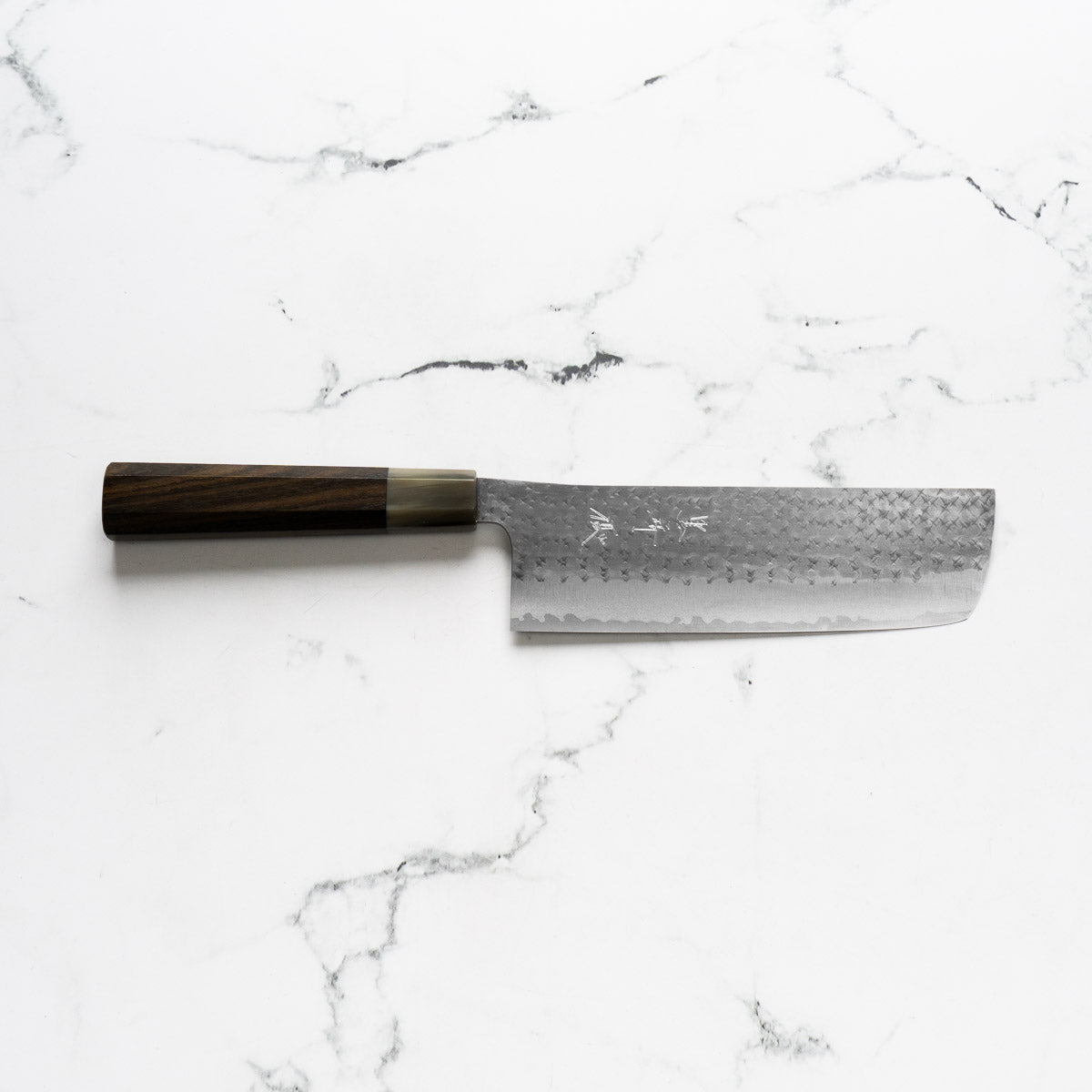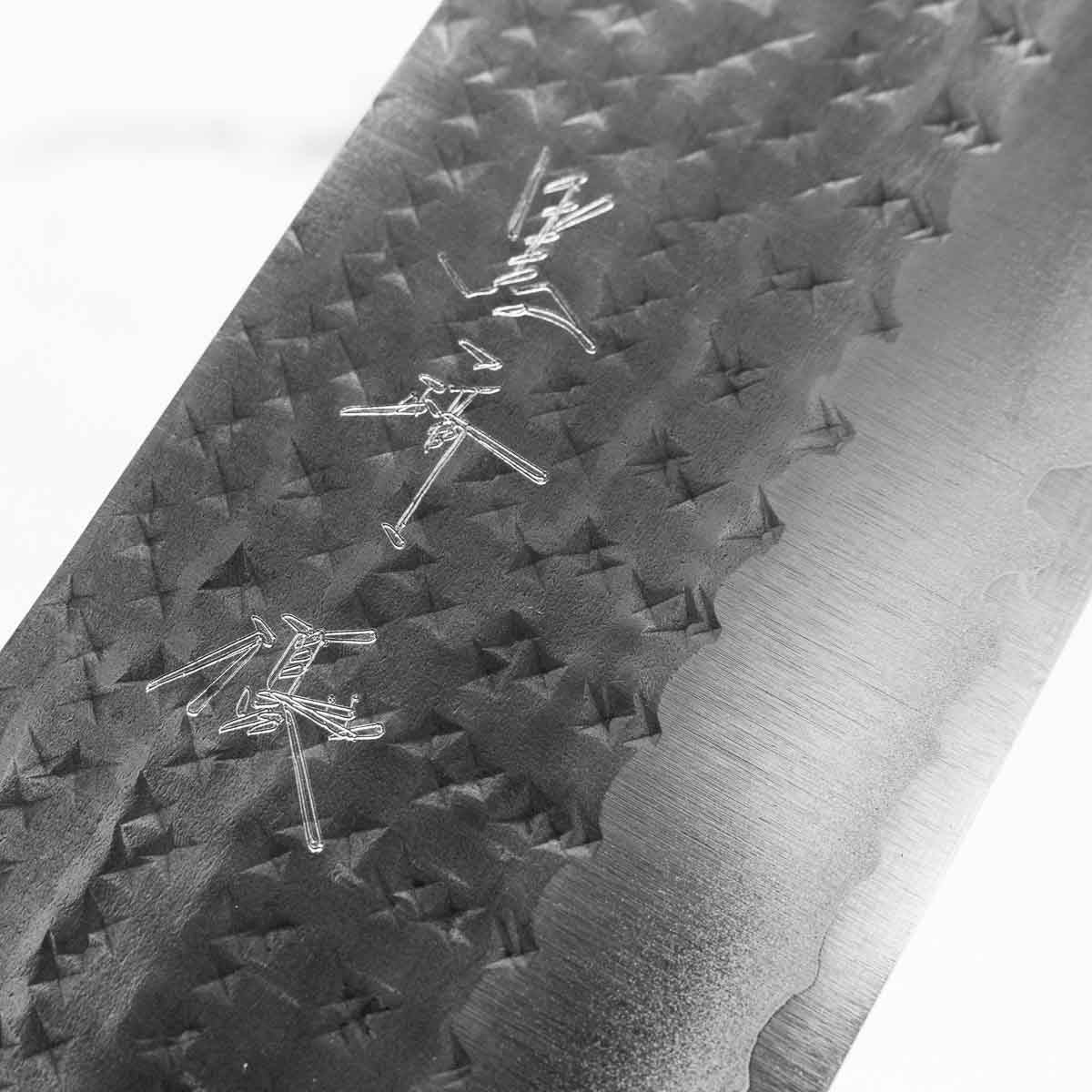 His knives are instantly recognizable for their striking Tsuchime and Suminagashi finishes, thin grinds, and use of high-performance steels such as SG2, HAP40, and stainless-clad Blue Super. Kurosaki’s Fujin series, with its dramatic wind-patterned hammer finish, helped cement his reputation as a blacksmith who blends artistry and technical brilliance in equal measure.