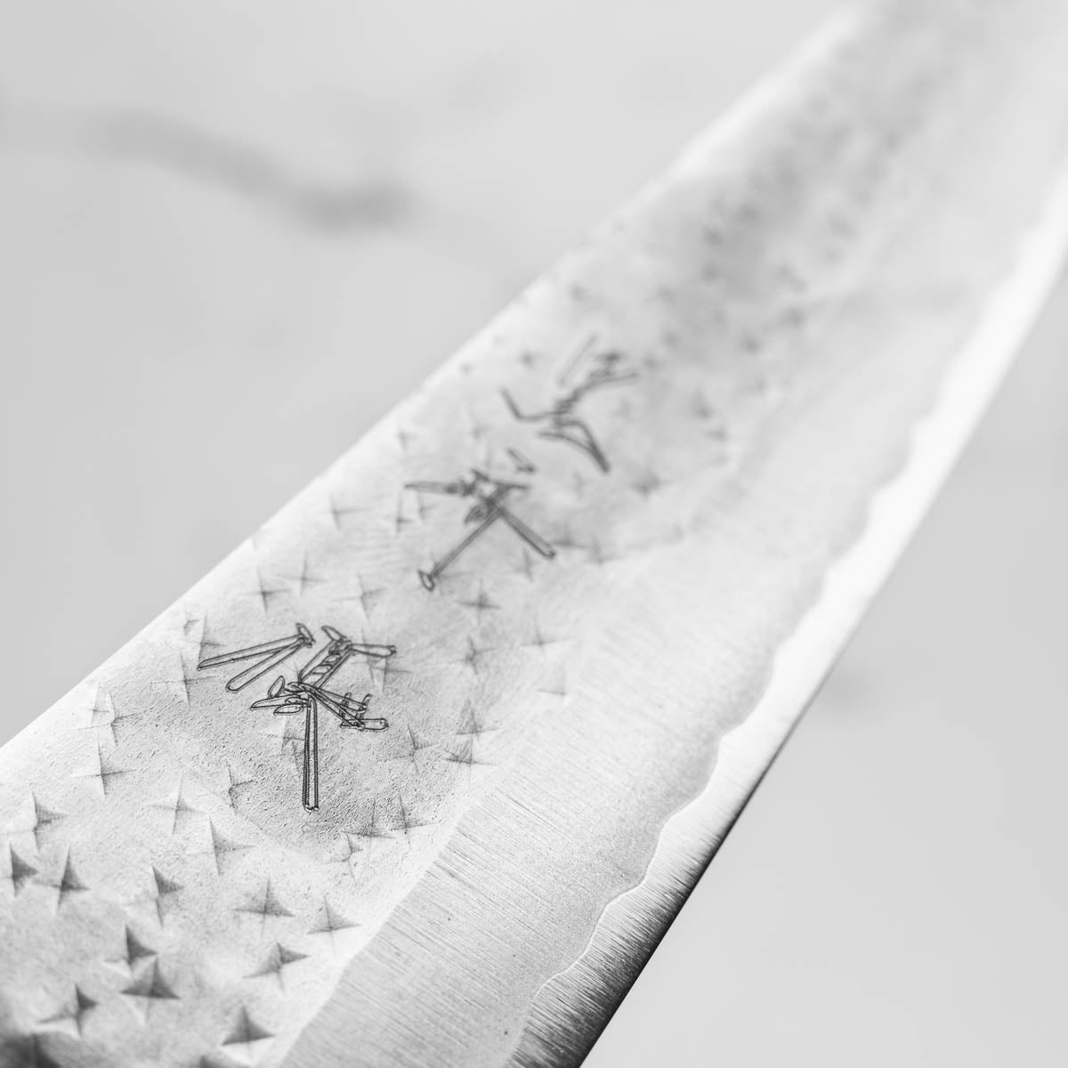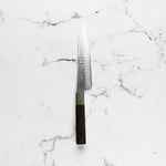 His knives are instantly recognizable for their striking Tsuchime and Suminagashi finishes, thin grinds, and use of high-performance steels such as SG2, HAP40, and stainless-clad Blue Super. Kurosaki’s Fujin series, with its dramatic wind-patterned hammer finish, helped cement his reputation as a blacksmith who blends artistry and technical brilliance in equal measure.
