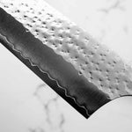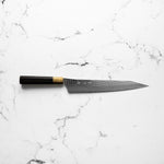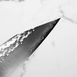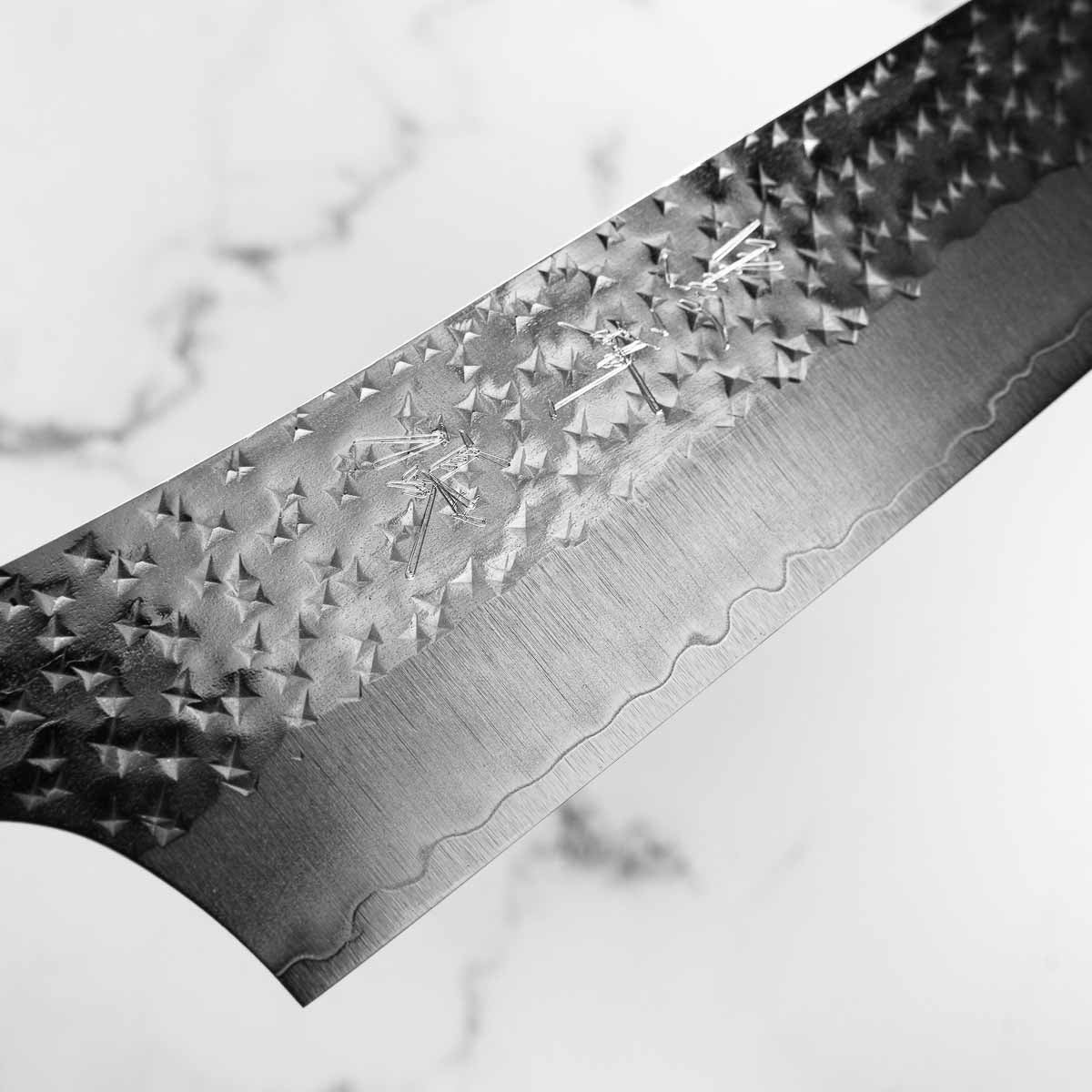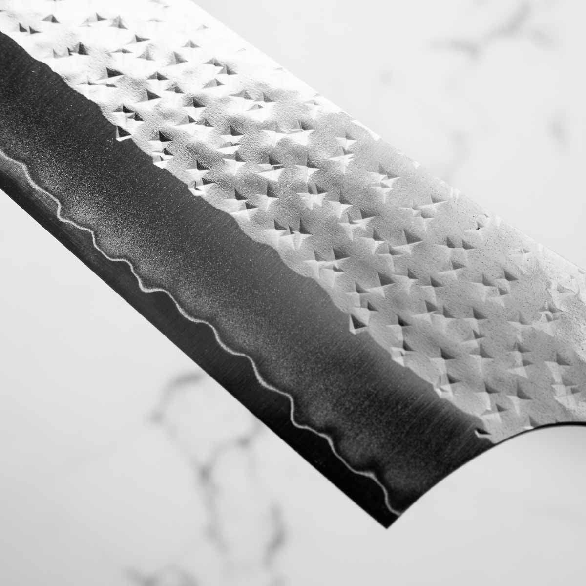His knives are instantly recognizable for their striking Tsuchime and Suminagashi finishes, thin grinds, and use of high-performance steels such as SG2, HAP40, and stainless-clad Blue Super. Kurosaki’s Fujin series, with its dramatic wind-patterned hammer finish, helped cement his reputation as a blacksmith who blends artistry and technical brilliance in equal measure.